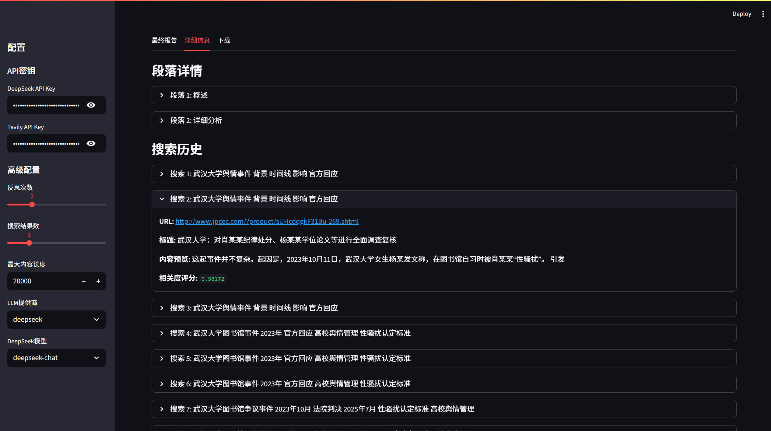 - 智能全量检索:DeepSearchAgent-Demo 自动集成 Tavily 引擎,根据查询生成结构化大纲,并针对每个段落自动执行多轮高精度搜索,瞬间聚合全球最新权威信源。