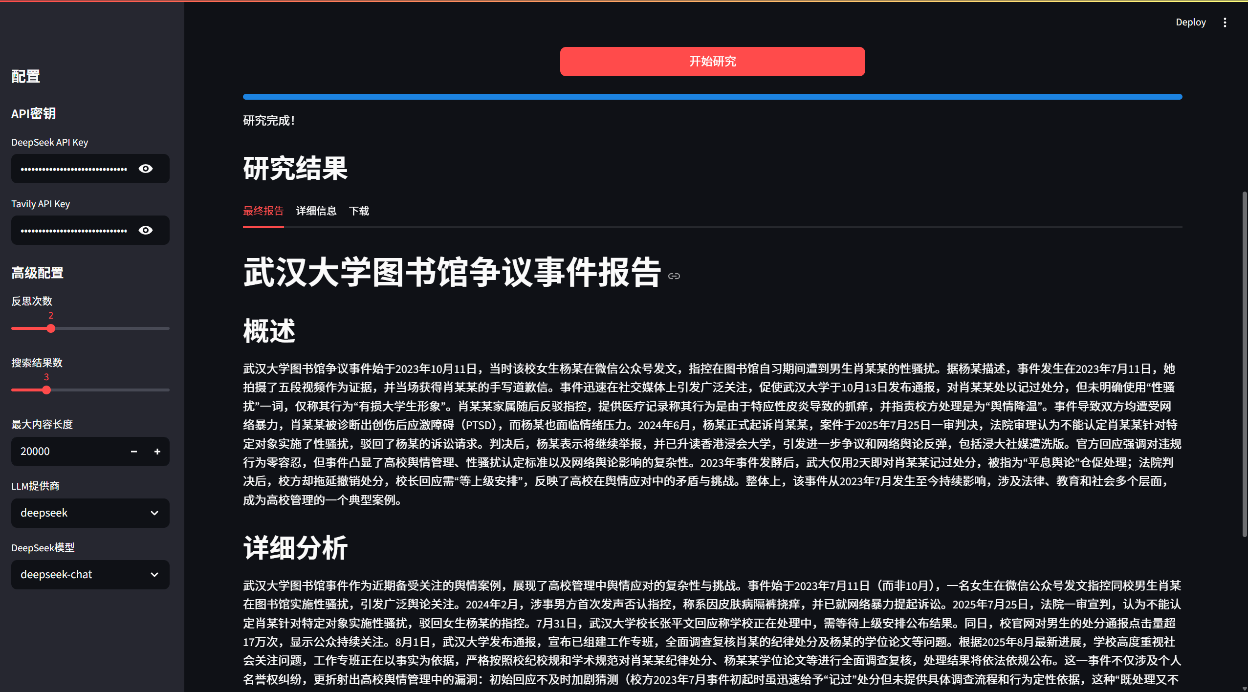 - 反思机制: 多轮反思优化,确保研究深度和完整性