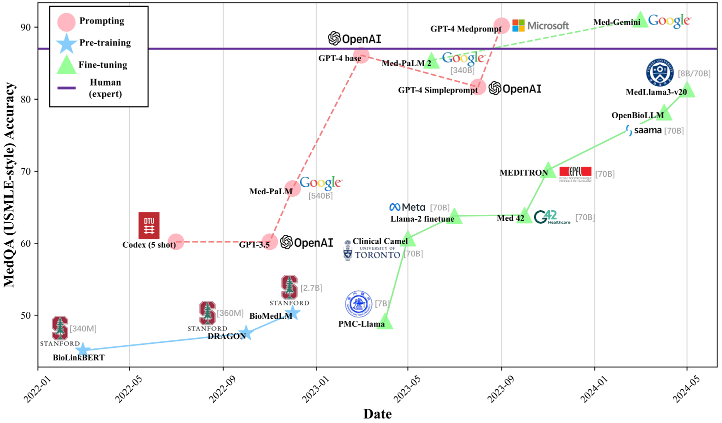 - [Huggingface, 2024.5] OpenBioLLM-70b: 推动开源大型语言模型在医疗领域的应用 模型