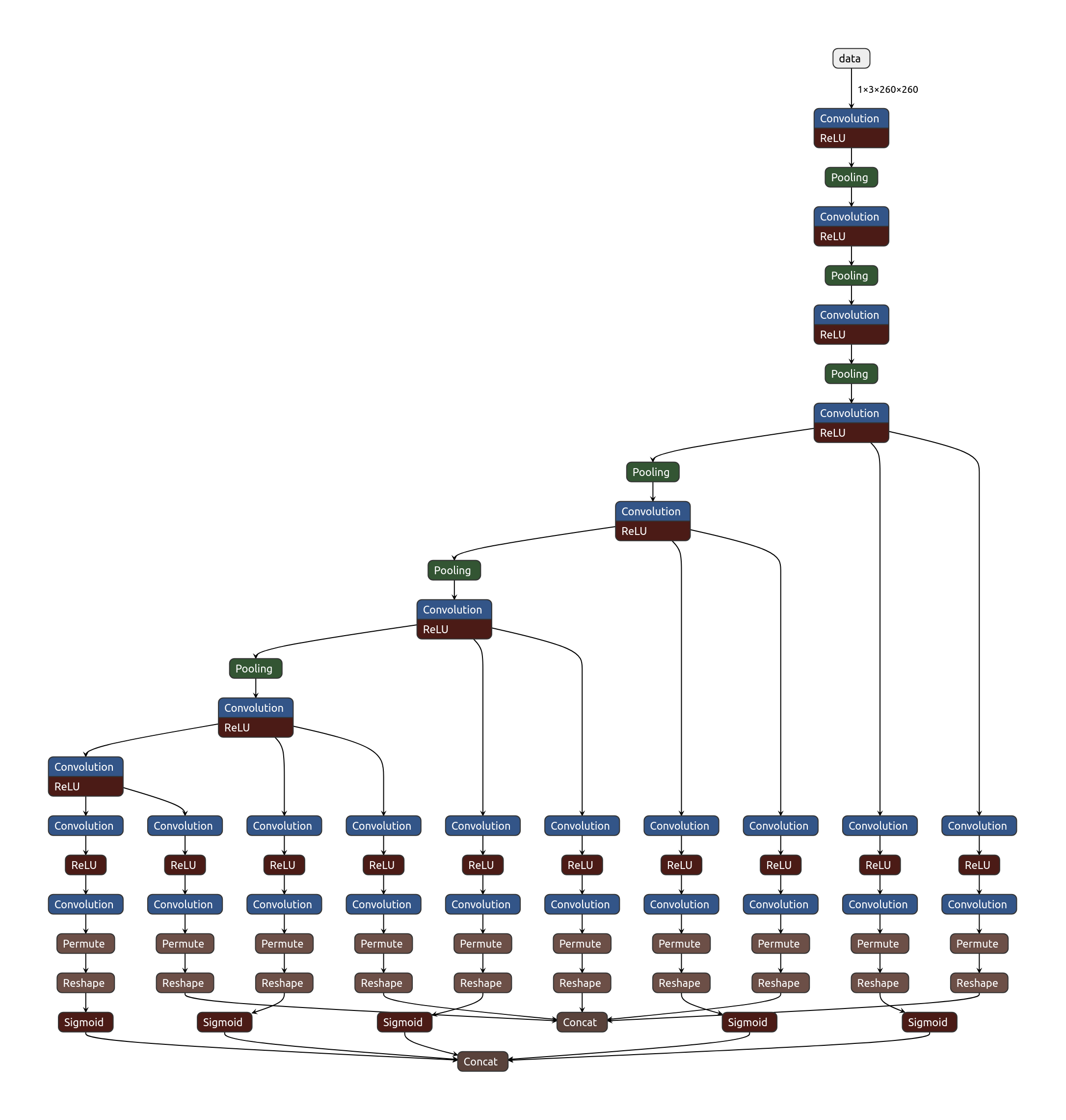 模型的输入尺寸为 260x260,骨干网络仅有 8 层卷积层。加上定位和分类层,整个模型总共只有 24 层。