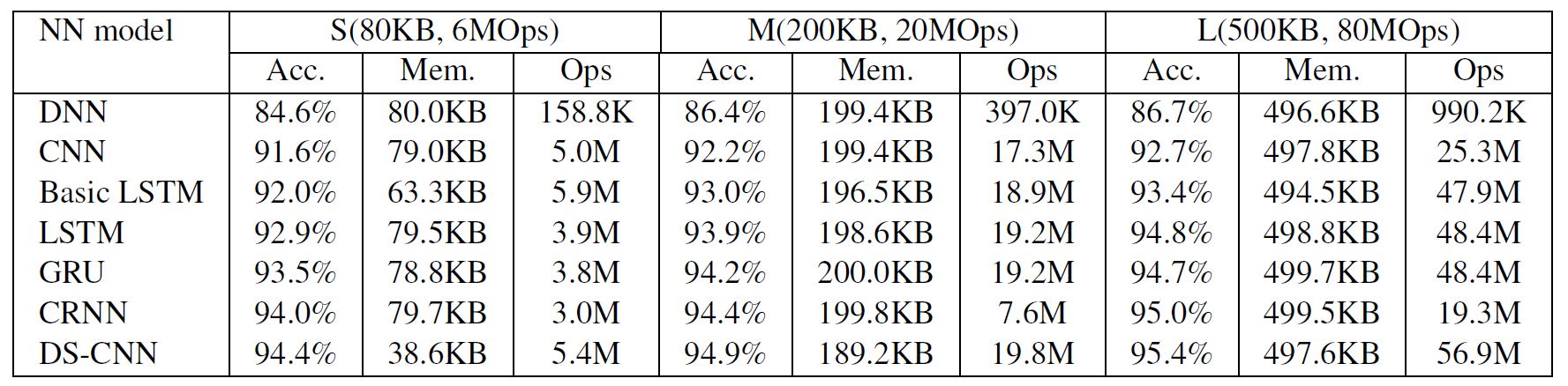 本文 arXiv 论文 中展示的不同神经网络架构(如 DNN、CNN、Basic LSTM、LSTM、GRU、CRNN 和 DS-CNN)的预训练模型(.pb 文件)已添加至 Pretrained_models 目录。下表还汇总了这些模型在验证集上的准确率、内存需求以及每次推理所需的运算次数。