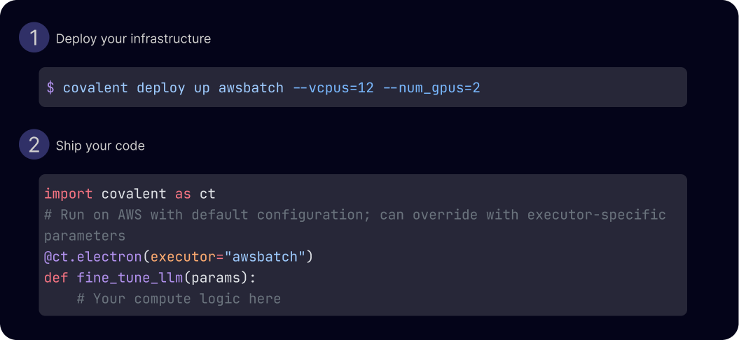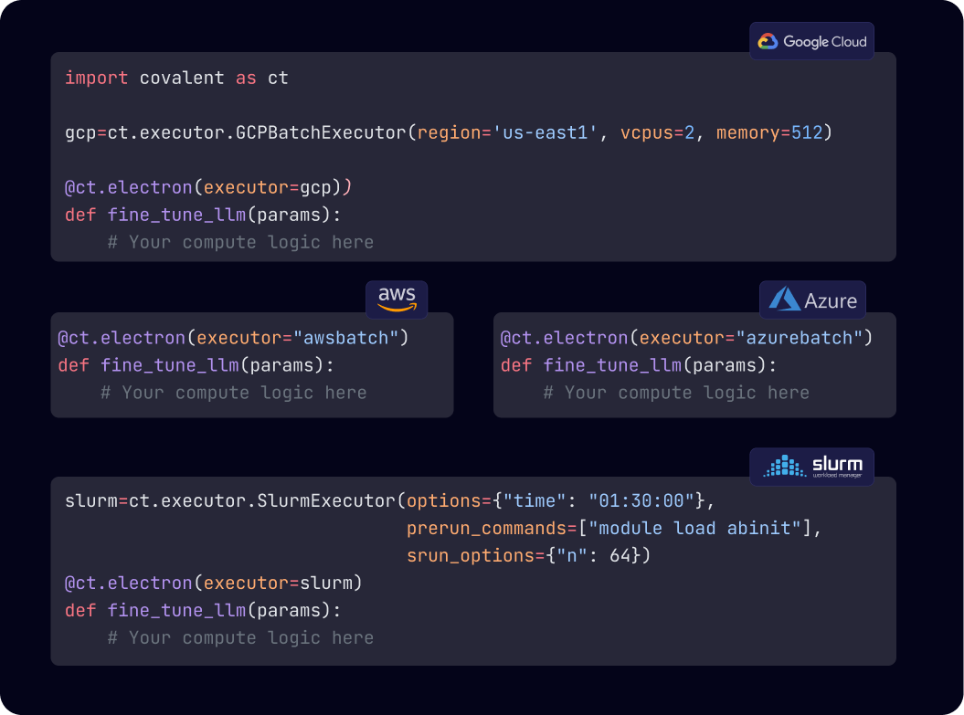 Covalent 是一款专为 AI 工程师、开发者及科研人员设计的 Python 库,旨在简化机器学习、高性能计算及量子计算工作流在异构环境中的编排与管理。它核心解决了跨平台部署的痛点:用户无需深入掌握复杂的云控制台、Terraform 或基础设施即代码(IaC)技术,仅需通过修改一行代码(替换装饰器),即可将 Python 函数无缝调度至任意公有云或本地集群(如 SLURM)运行。