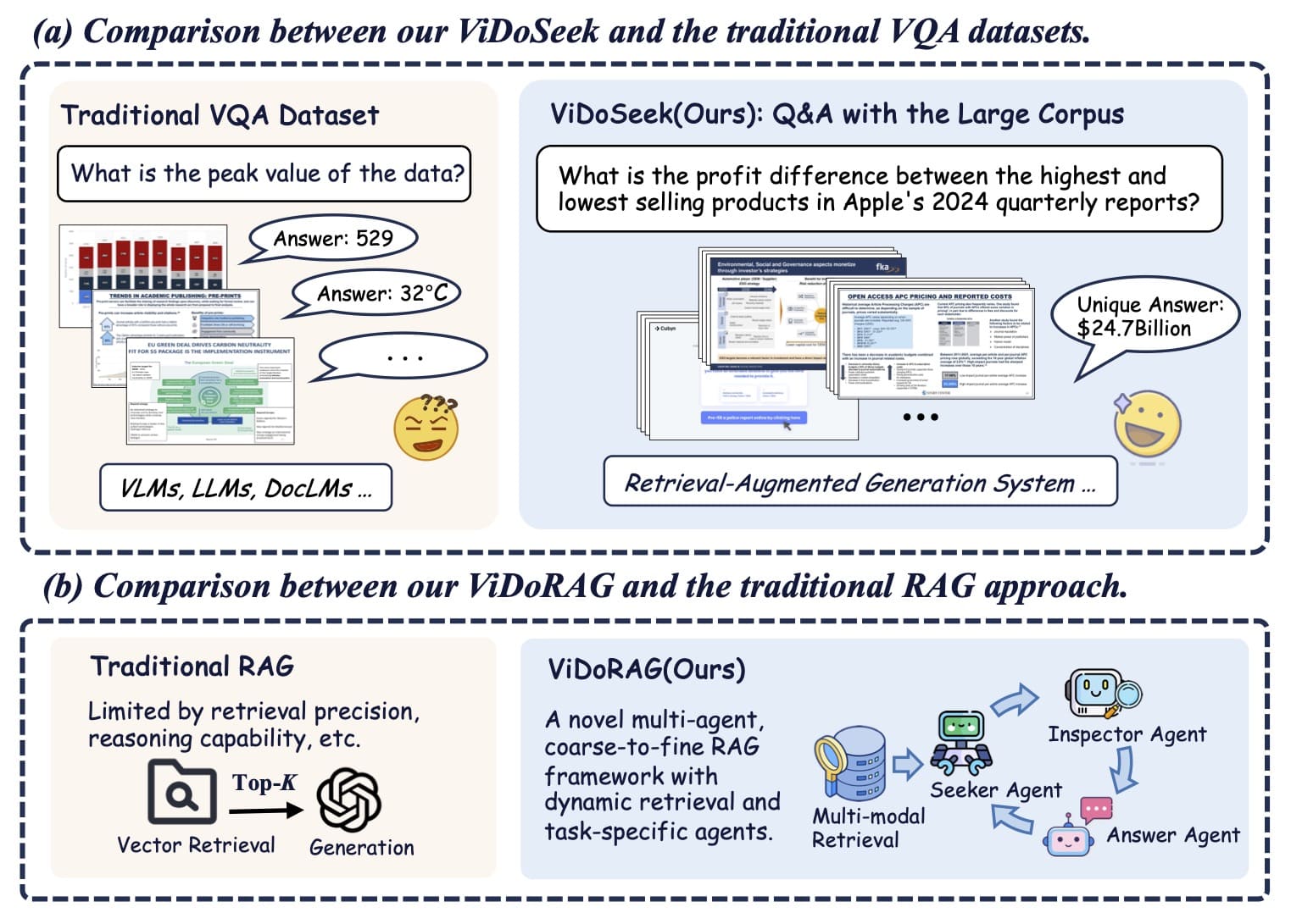 - 我们推出了 ViDoSeek,这是一个专为富含视觉信息的文档检索—推理—回答设计的基准,完全适用于大规模文档语料库中 RAG 模型的评估。