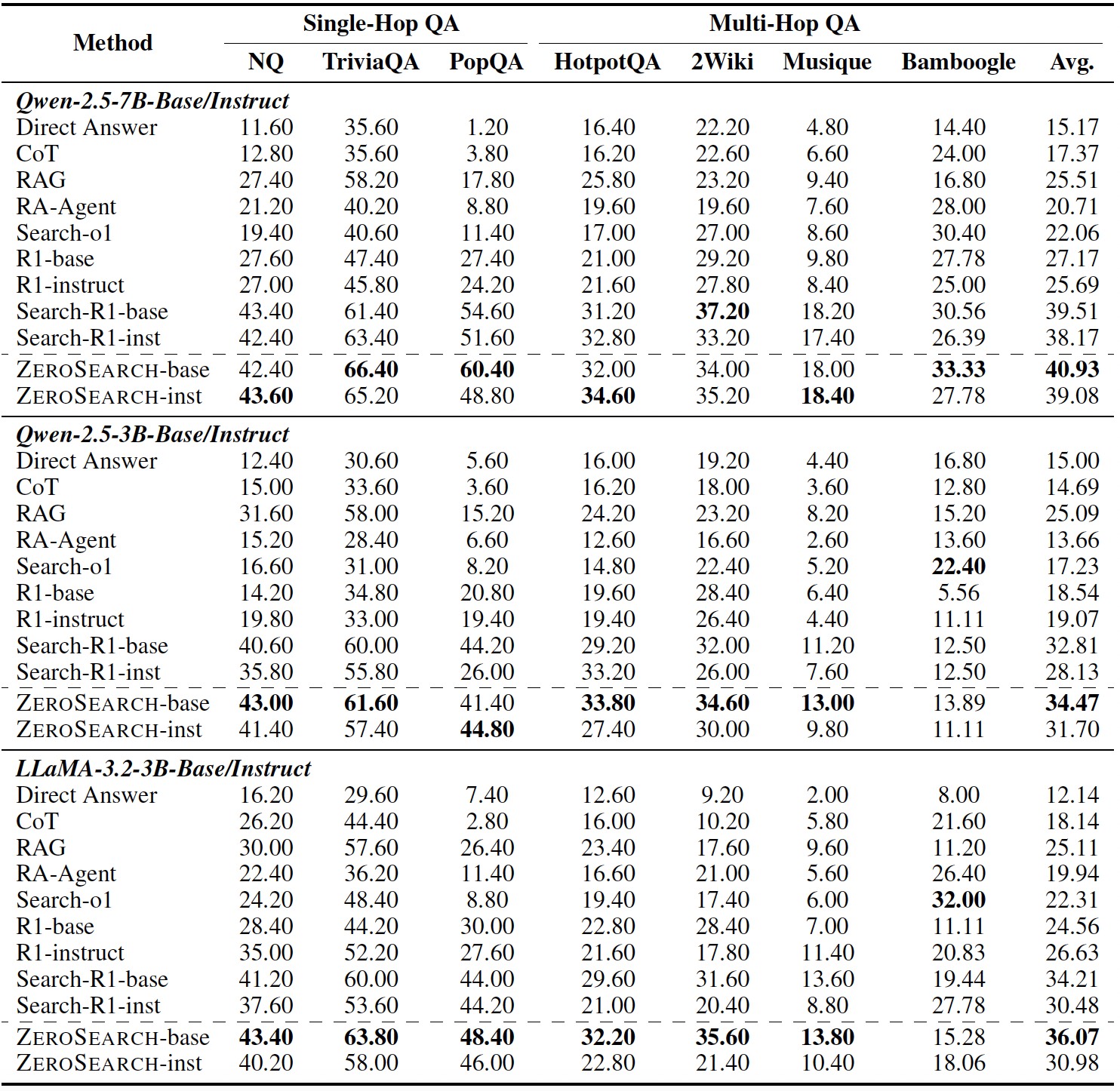 - 我们在领域内和领域外的数据集上进行了广泛的实验。结果表明,ZeroSearch 的性能优于基于真实搜索引擎的模型,同时零 API 成本。此外,它在不同规模的基础模型和指令微调模型中都表现出良好的泛化能力,并且支持多种强化学习算法。