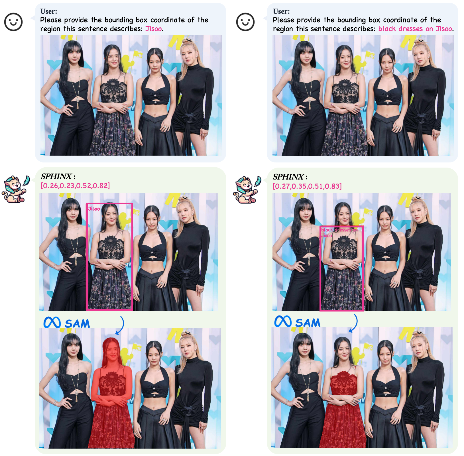 💡 现在,我们的 SPHINX 模型支持根据输入提示生成高质量的边界框,并为图像中的所有对象呈现由 SAM 创建的掩码。快来试试吧这里! 🚀