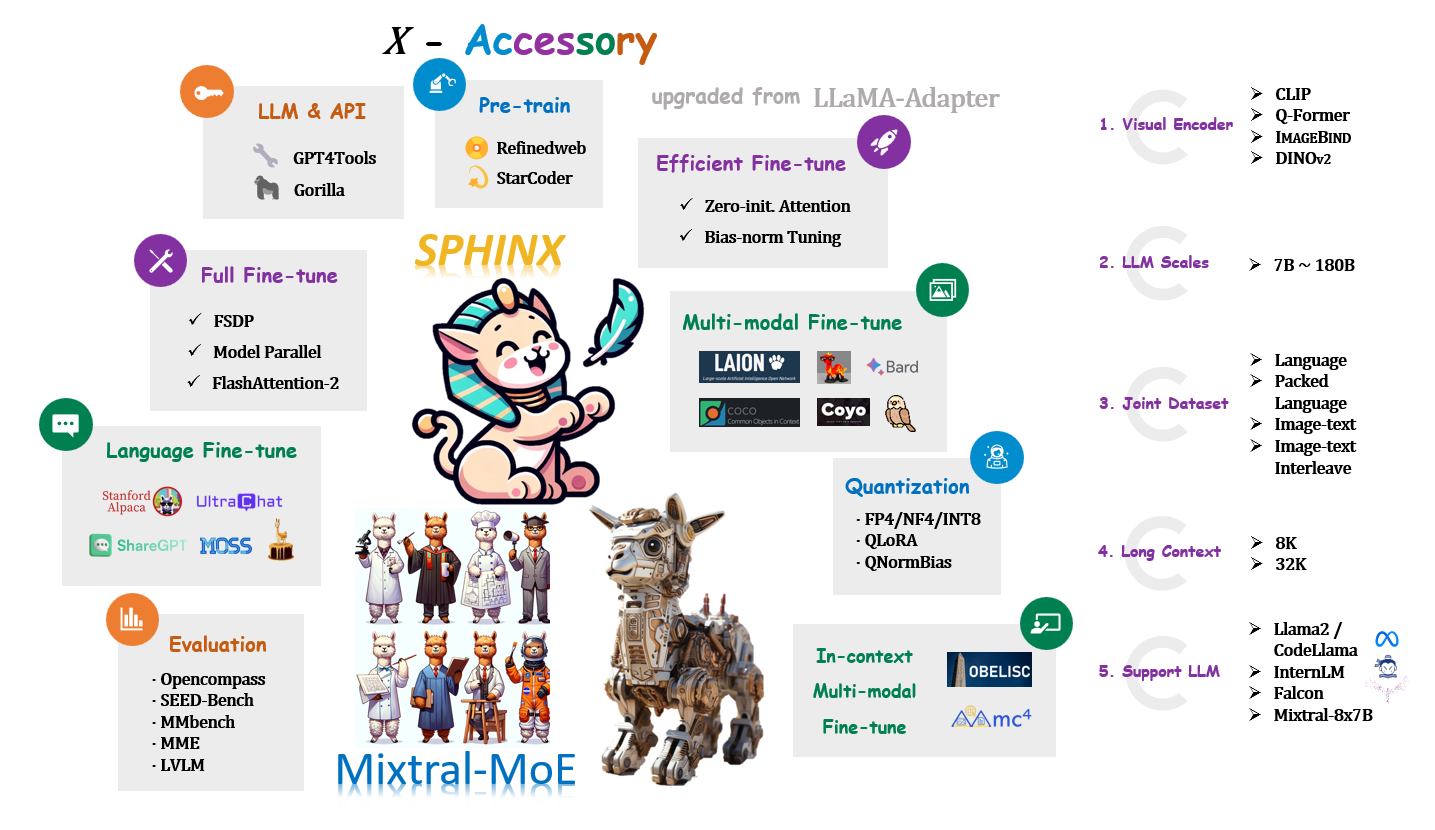 ✨在该工具包中,我们推出了 SPHINX,这是一个多功能的多模态大型语言模型(MLLM),它融合了多样化的训练任务、数据领域以及视觉嵌入。