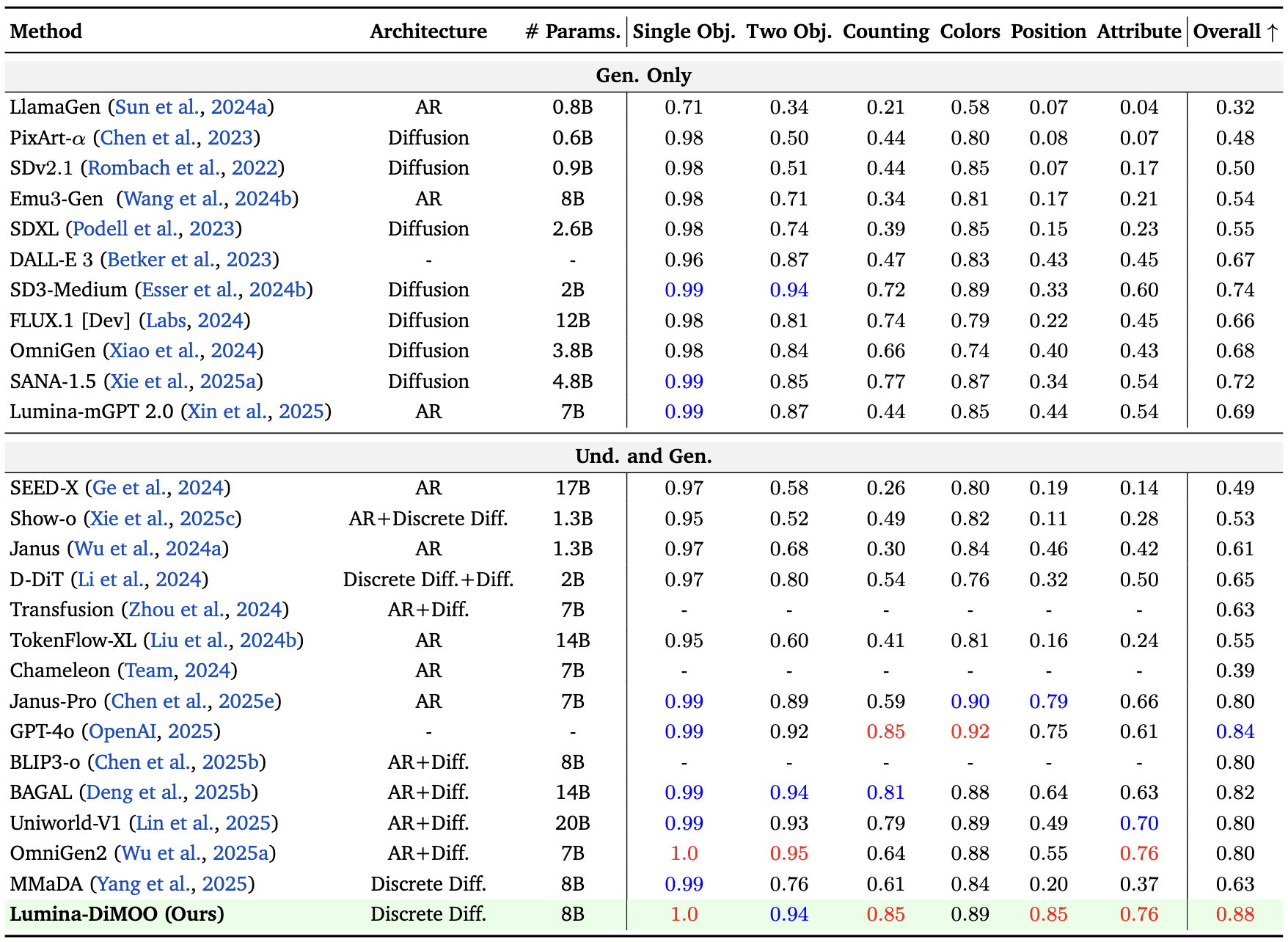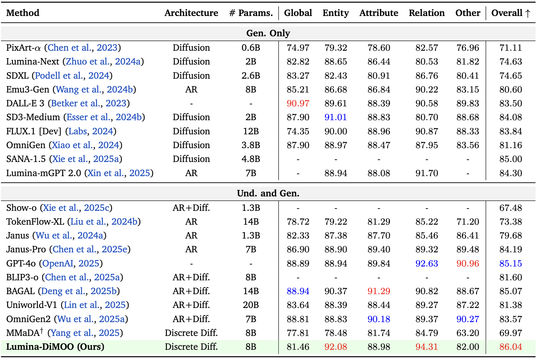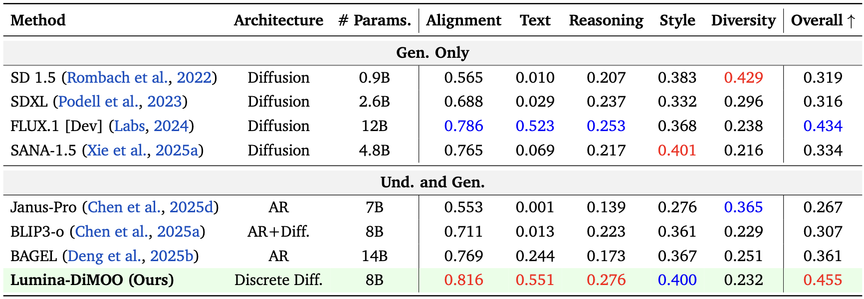- [2025-09-20] 🎉 在最新的UniGenBench排行榜(由腾讯混元团队维护)中,Lumina-DiMOO的生成评估在所有开源统一模型中排名第一🥇。
