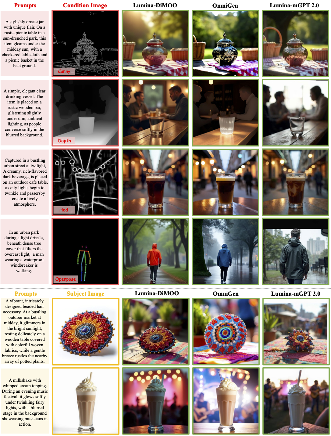 多功能的多模态能力: Lumina-DiMOO支持广泛的多模态任务,包括文本到图像的生成(允许任意分辨率和高分辨率)、图像到图像的生成(例如图像编辑、主体驱动的生成和图像修复等),以及先进的图像理解。