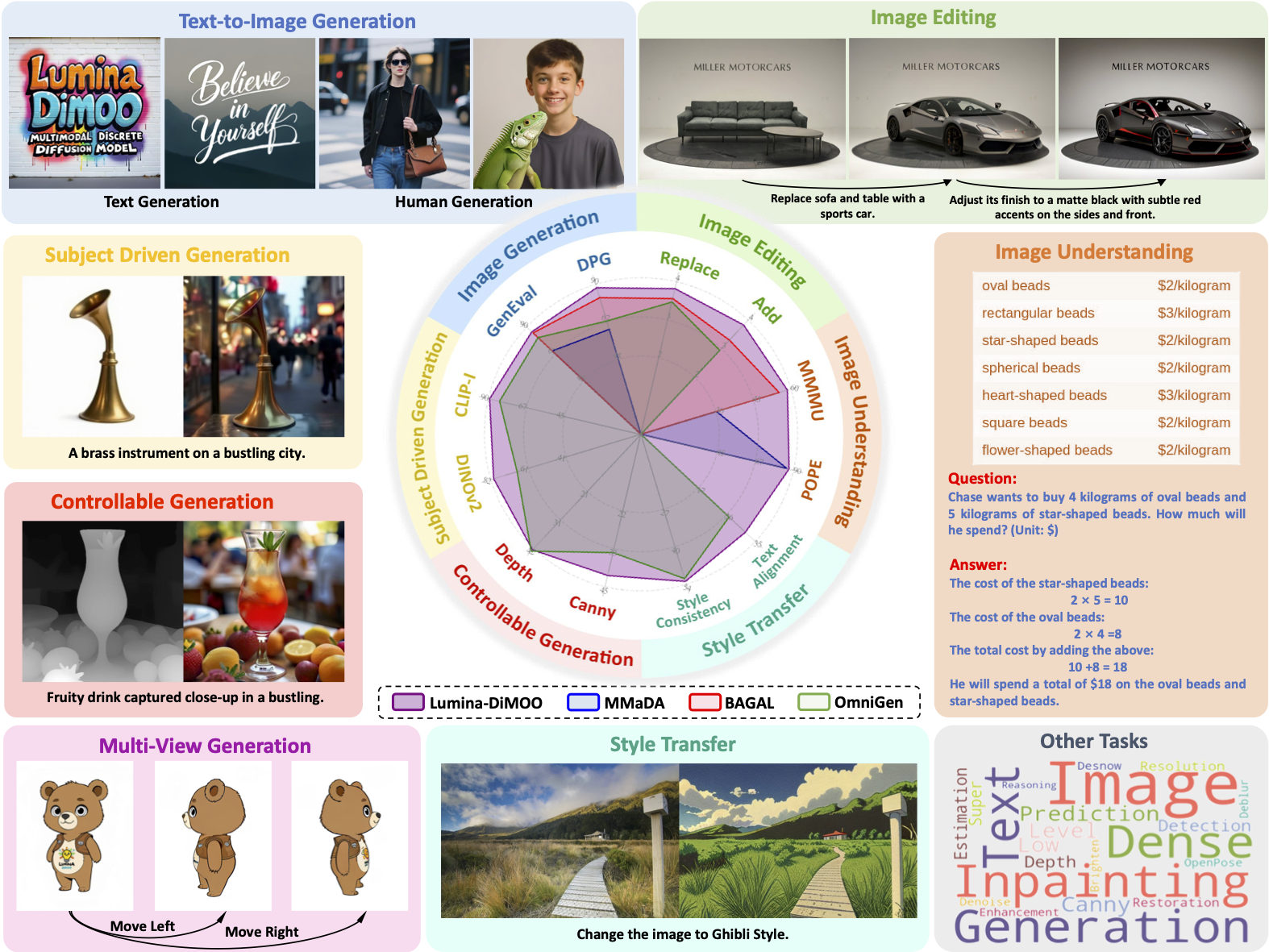我们推出了Lumina-DiMOO,这是一种用于无缝多模态生成与理解的全能基础模型。Lumina-DiMOO以四项关键创新而著称: