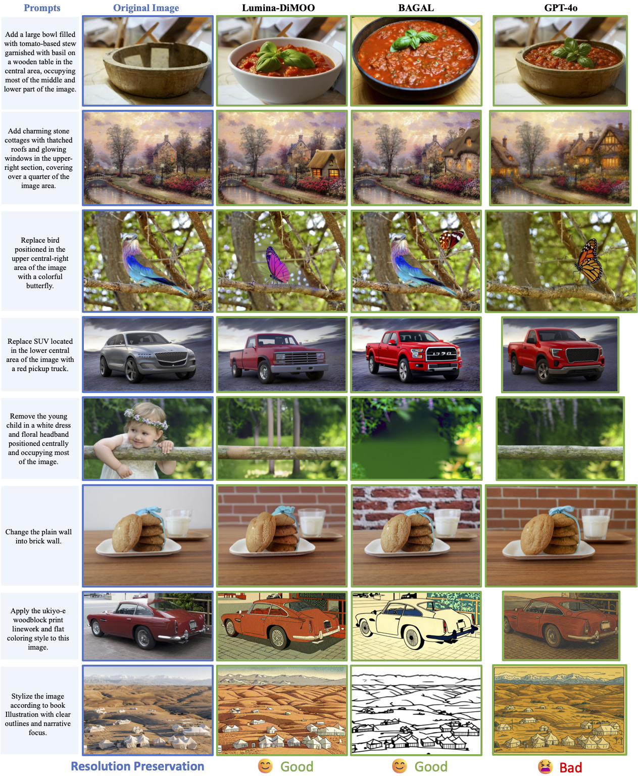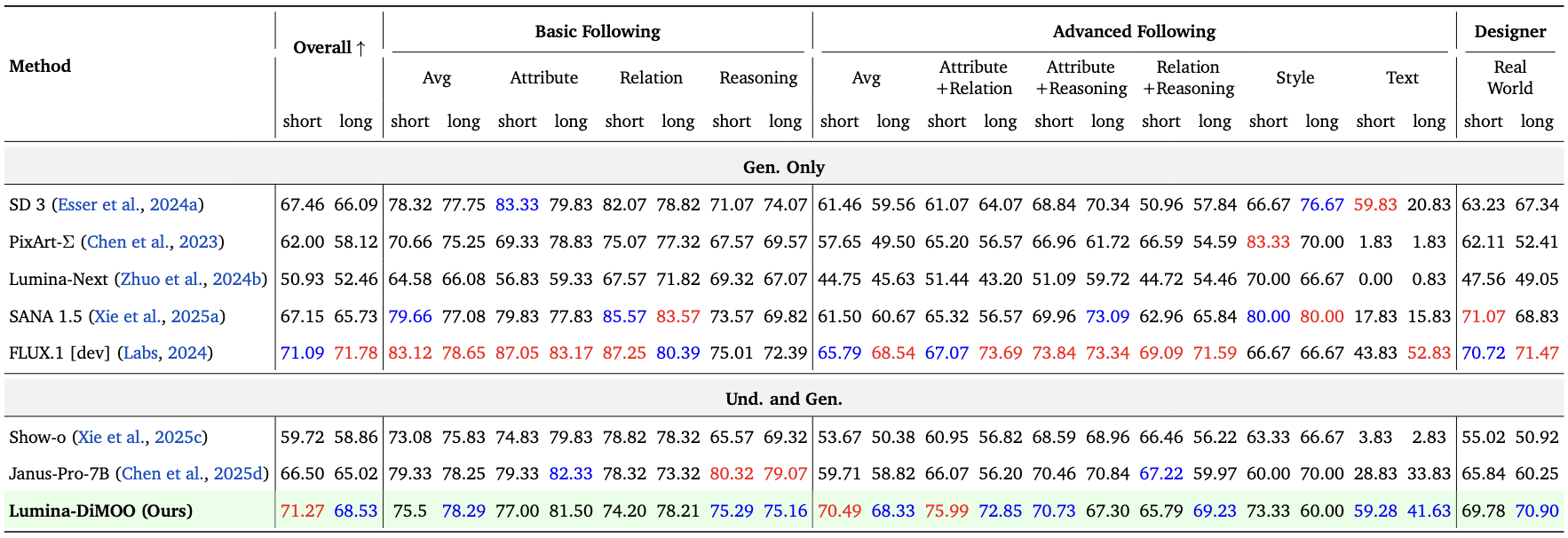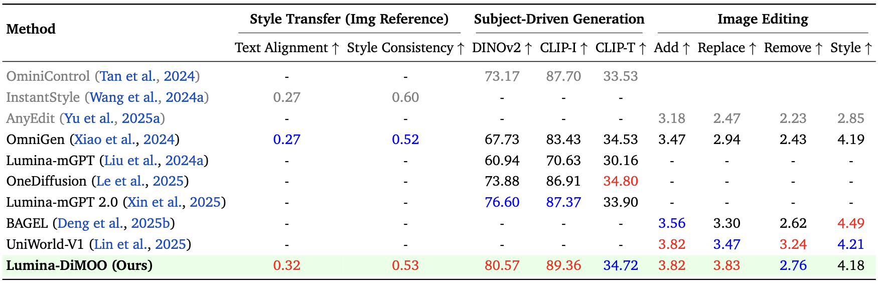 卓越的性能: Lumina-DiMOO在多个基准测试中达到了最先进的水平,超越了现有的开源多模态统一模型,为该领域树立了新的标准。