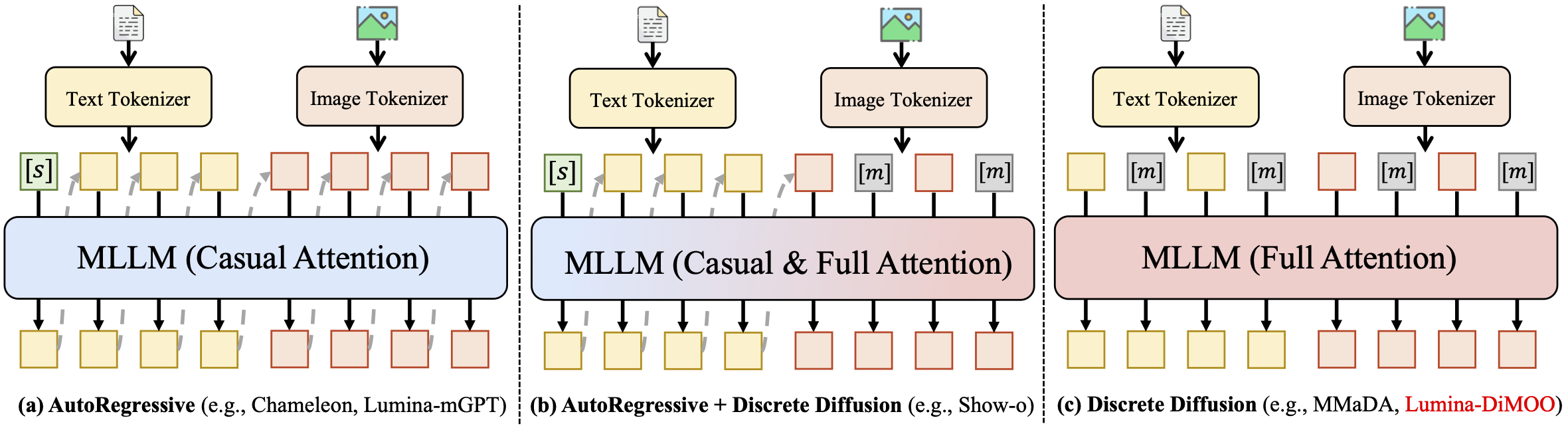 统一的离散扩散架构: Lumina-DiMOO通过采用完全离散的扩散建模来处理各种模态的输入和输出,从而区别于以往的统一模型。