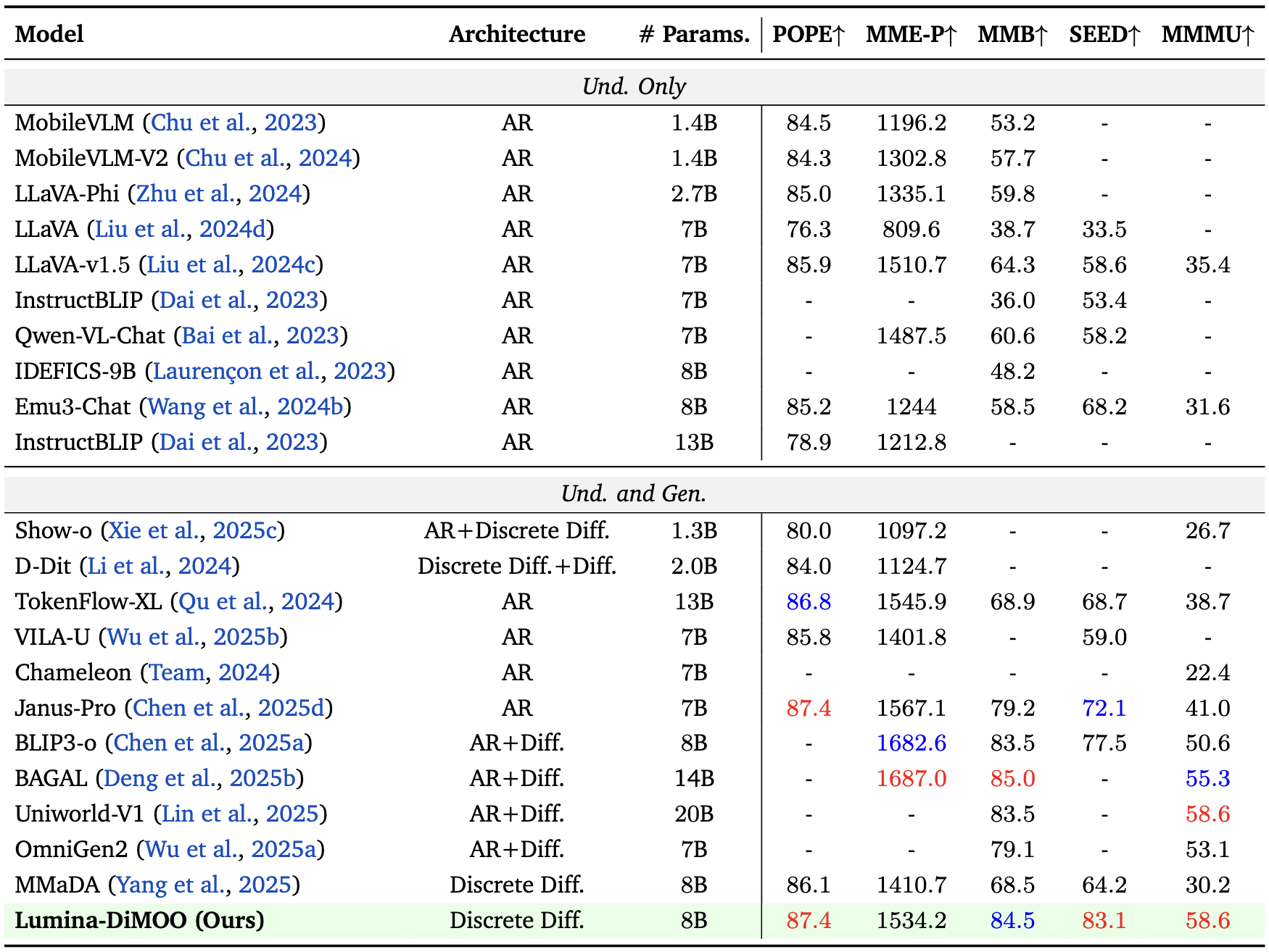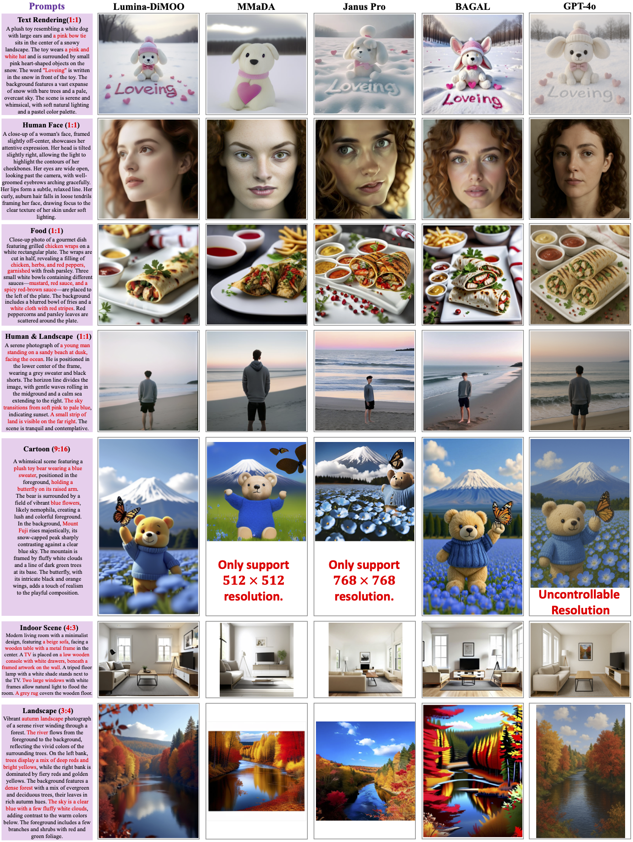 Lumina-DiMOO设置: 对于图像生成,我们采样64步。对于图像理解,我们将块长度设为256,采样步数设为128。