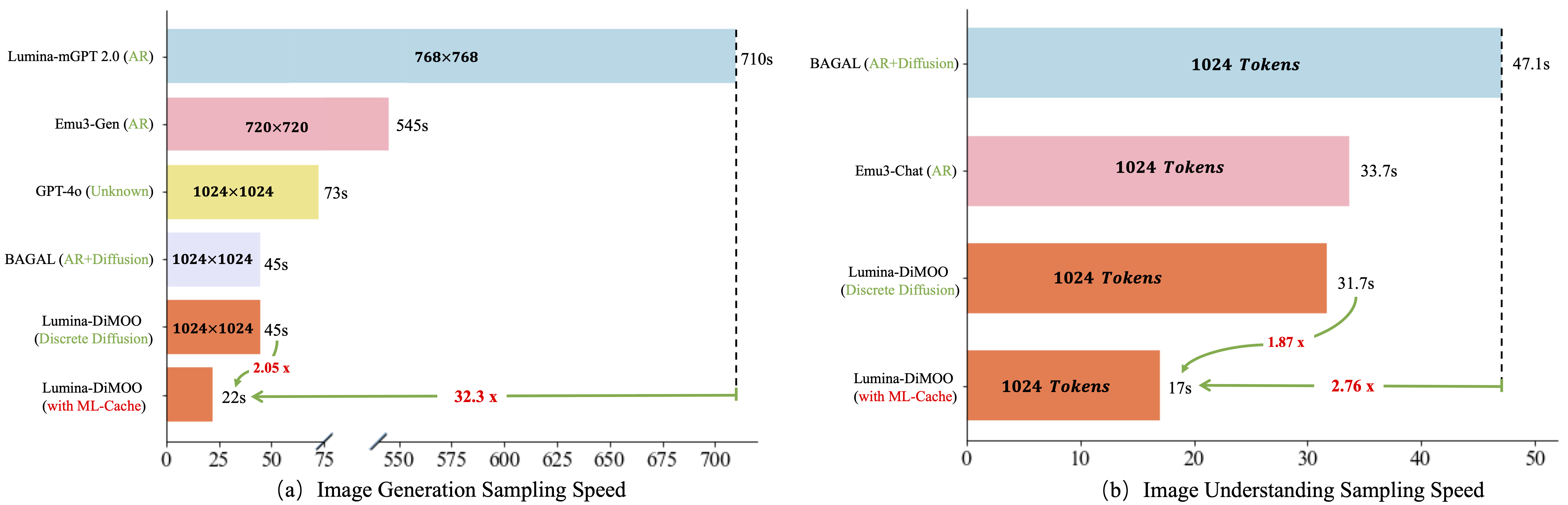 更高的采样效率: 与之前的AR或混合AR-扩散范式相比,Lumina-DiMOO展现出卓越的采样效率。此外,我们设计了一种定制的缓存方法,可将采样速度进一步提升2倍。