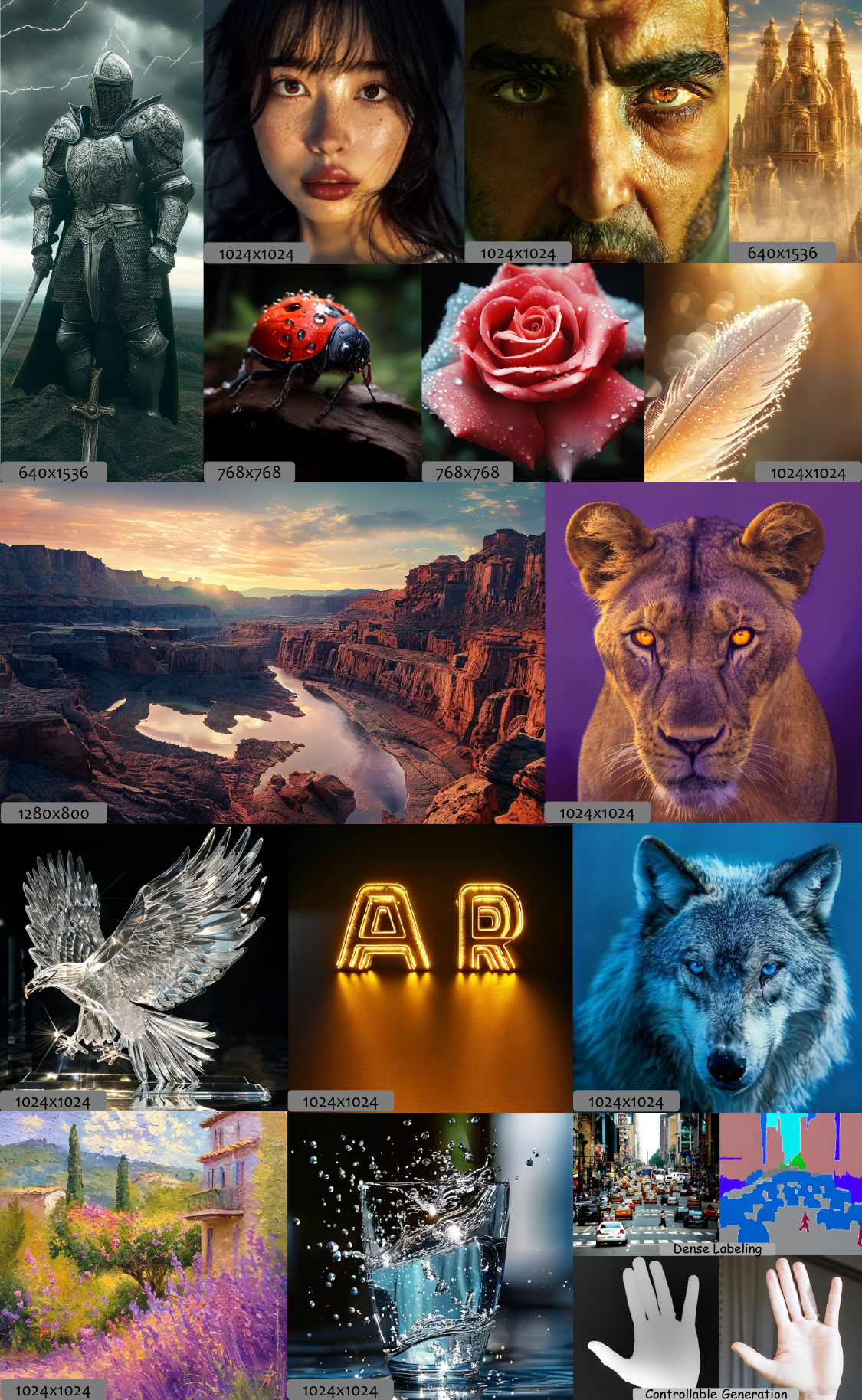 - 灵活的高清输出:原生支持 768x768 及更高分辨率的灵活生成,并通过 Omni-SFT 技术在一个界面无缝切换文生图、图生图等多种任务模式。