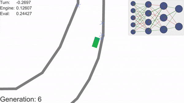 用户界面始终显示当前最佳车辆的相关数据。左上角显示神经网络的输出(发动机推力和转向力)。输出下方显示评估值(评估值等于赛道完成百分比)。左下角显示当前的代数计数器。右上角则展示当前最佳车辆的神经网络结构,其中各连接线的颜色和宽度代表权重的大小与正负:连线越粗,表示权重的绝对值越大;绿色表示权重为正,红色表示权重为负。