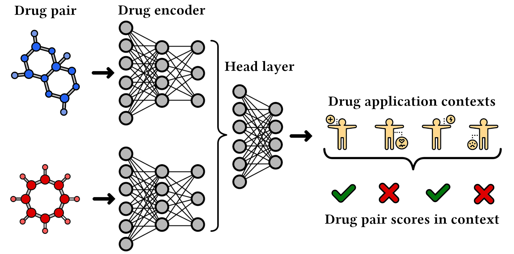 - 输出层,在给定的用药情境下输出评分——在我们的示意图中是多药联用的情境。