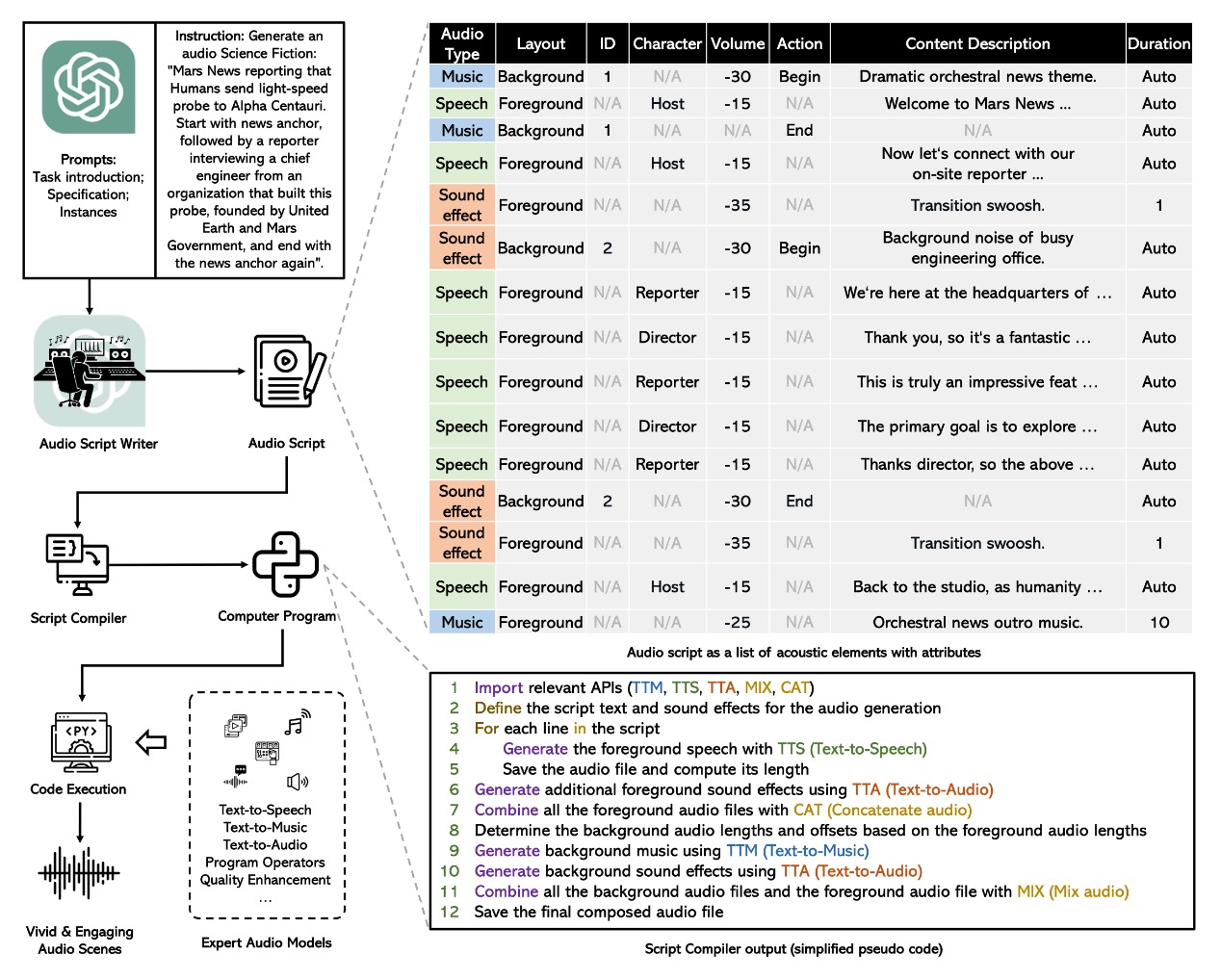 从一段文本提示出发,WavJourney能够生成具有引人入胜故事情节的音频内容,其中包括个性化配音演员、情境化的逼真语音、富有情感共鸣的音乐创作以及增强听觉体验的震撼音效。