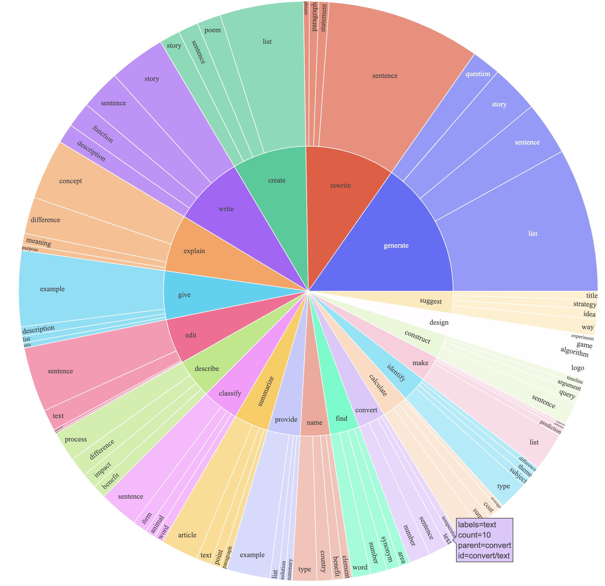 这样,我们就以更低的成本(不到 500 美元)得到了包含 52K 个样例的遵循指令数据集。初步研究还表明,我们生成的 52K 条数据比 self-instruct 发布的数据更加多样化。 我们绘制了下图(风格类似于 self-instruct 论文 中的图 2),以展示我们数据的多样性。图表中的内圈代表指令的动词根,外圈则代表直接宾语。