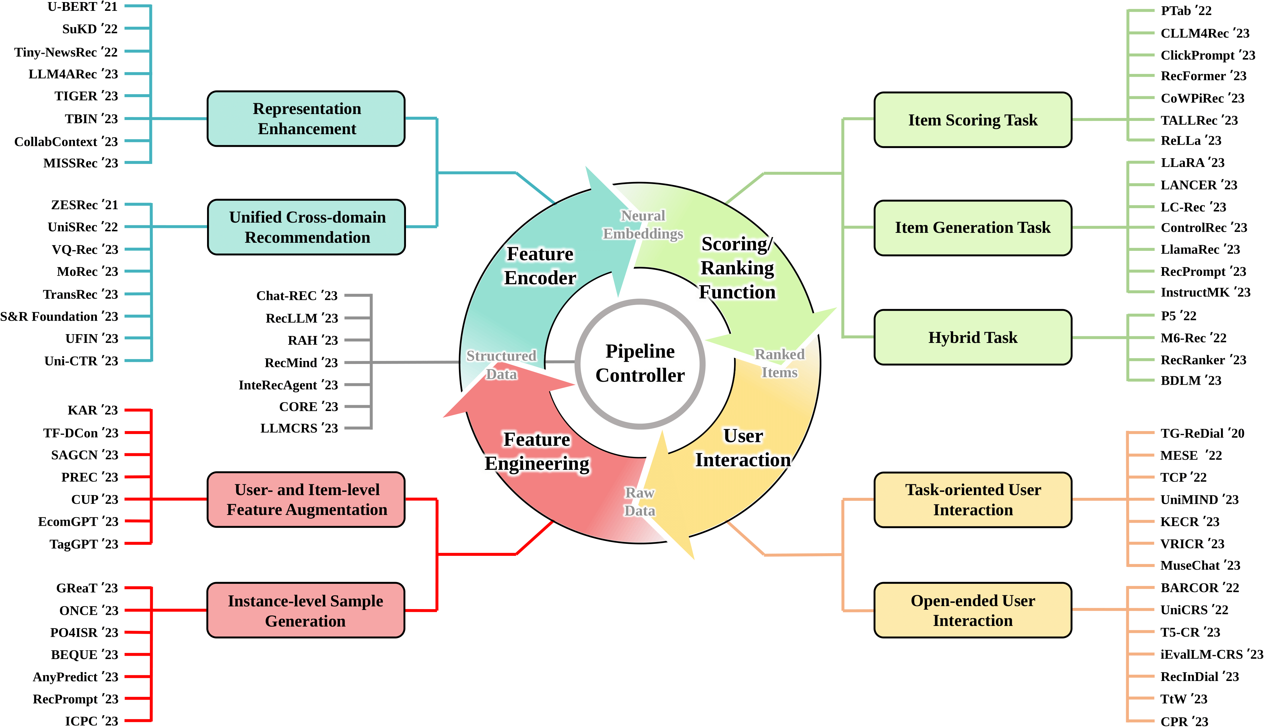 我们根据LLM将在推荐系统流程中的哪个环节被应用来进行论文分类,如下图所示。