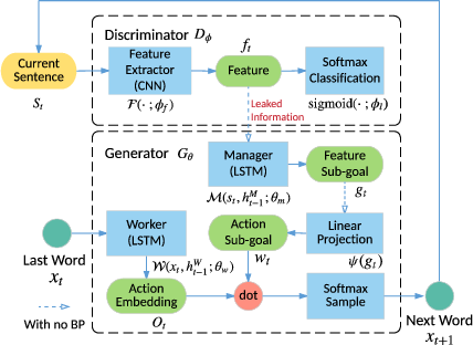 自动生成连贯且语义上有意义的文本在机器翻译、对话系统、图像字幕生成等领域有着广泛的应用。最近,通过结合策略梯度方法,利用判别模型作为强化学习策略来指导生成模型训练的生成对抗网络(GAN),在文本生成任务中展现了令人鼓舞的效果。然而,这种标量式的指导信号只有在整个文本生成完成后才能获得,并且在生成过程中缺乏关于文本结构的中间信息。因此,当生成的文本样本较长(超过20个词)时,其性能会受到限制。在本项目中,我们提出了一种名为LeakGAN的新框架,以解决长文本生成问题。我们允许判别网络将其提取的高层特征“泄漏”给生成网络,从而进一步辅助生成过程的指导。生成器通过一个额外的Manager模块将这些信息性信号融入到每一步的生成中:该模块接收当前已生成词的特征表示,并输出一个潜在向量,用以指导Worker模块进行下一步的词生成。我们在合成数据以及多种真实世界任务上的大量实验表明,LeakGAN不仅在长文本生成方面非常有效,而且在短文本生成场景中也显著提升了性能。更重要的是,在没有任何监督的情况下,LeakGAN仅通过Manager和Worker之间的交互就能隐式地学习句子结构。