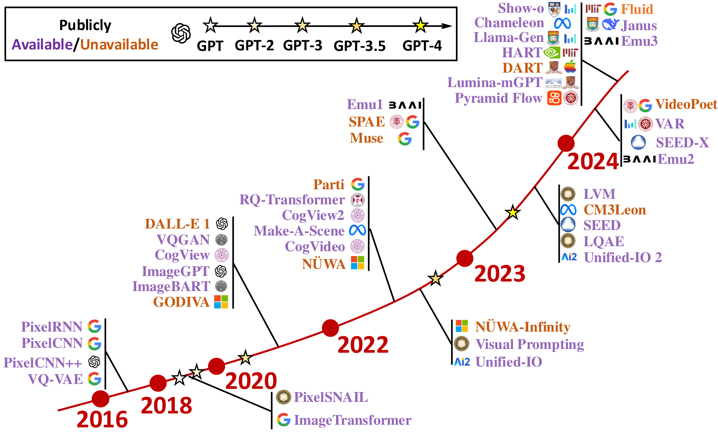 [2025-11-01] ⏸️ 经过一年自回归视觉生成技术的快速发展,目前该领域已形成两大明确趋势:统一的多模态模型和自回归扩散驱动的视频生成。我们现有的仓库分类已无法全面反映这一不断演化的格局,因此我们将进入维护模式,并从今天起暂停主动更新。不过,仓库仍可作为参考资料使用,我们也欢迎针对新趋势的定向 PR 提交(如新增内容、修正错误或重新组织结构)。感谢大家的支持!🙏