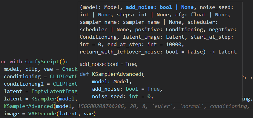 [default] 是安装常用依赖项所必需的。其他选项请参阅 pyproject.toml。如果未指定任何选项,ComfyScript 将在没有任何依赖的情况下安装。