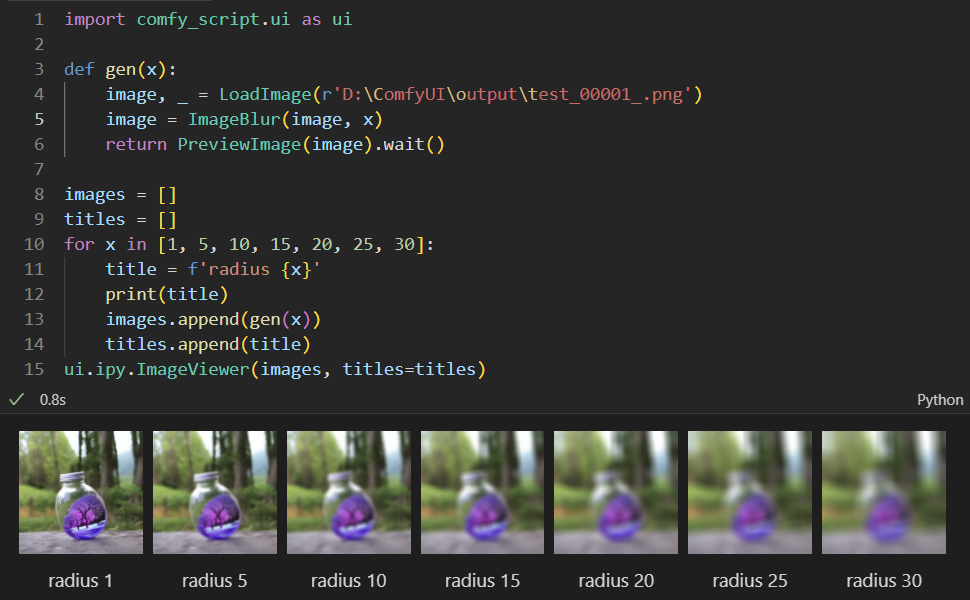 for循环即可自动生成并执行上百种参数组合的实验,大幅缩短研发周期。 - 将 ComfyUI 节点作为普通 Python 函数调用,无缝混合使用原生库(如 NumPy 处理数据)与 AI 生成逻辑,代码结构清晰统一。