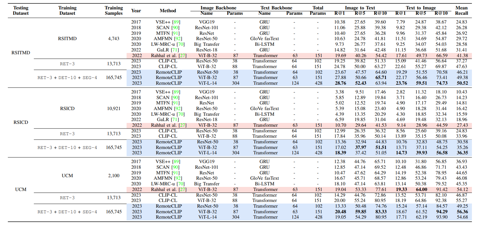 为了使用 RemoteCLIP 进行跨模态检索,我们在测试集上提取图像和文本特征,进行 L-2 归一化,并基于点积相似度度量检索最相似的样本。我们展示了 top-1(R@1)、top-5(R@5)、top-10(R@10)的检索准确率,以及这些值的平均准确率。