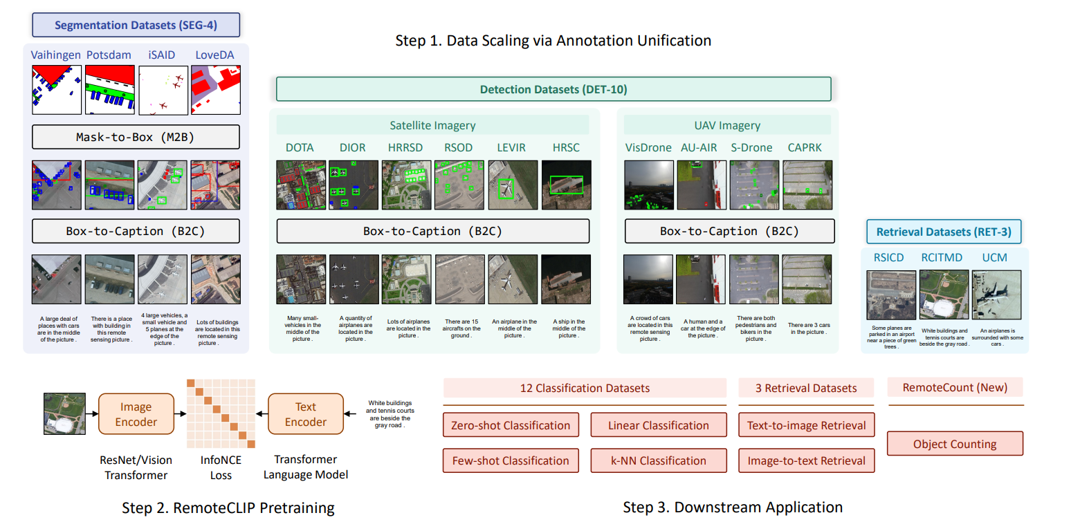 针对这些局限性,我们提出了RemoteCLIP,这是首个用于遥感的视觉语言基础模型,旨在学习具有丰富语义的稳健视觉特征,以及对齐的文本嵌入,以实现无缝的下游应用。 为了解决预训练数据稀缺的问题,我们采用了数据扩增技术,通过基于Box-to-Caption(B2C)和Mask-to-Box(M2B)转换的异构标注转换,并进一步引入无人机影像,最终构建了一个规模扩大12倍的预训练数据集。