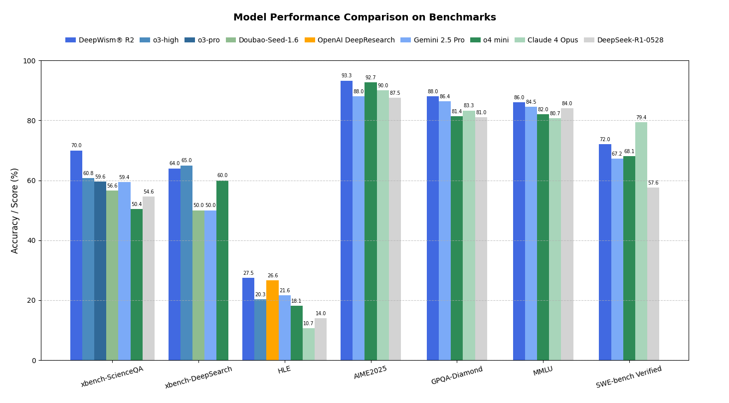 全面的基准测试表现 DeepWism® R2在多个具有挑战性的基准测试中表现出色,在复杂推理和问题解决任务中创造了新的最先进水平。