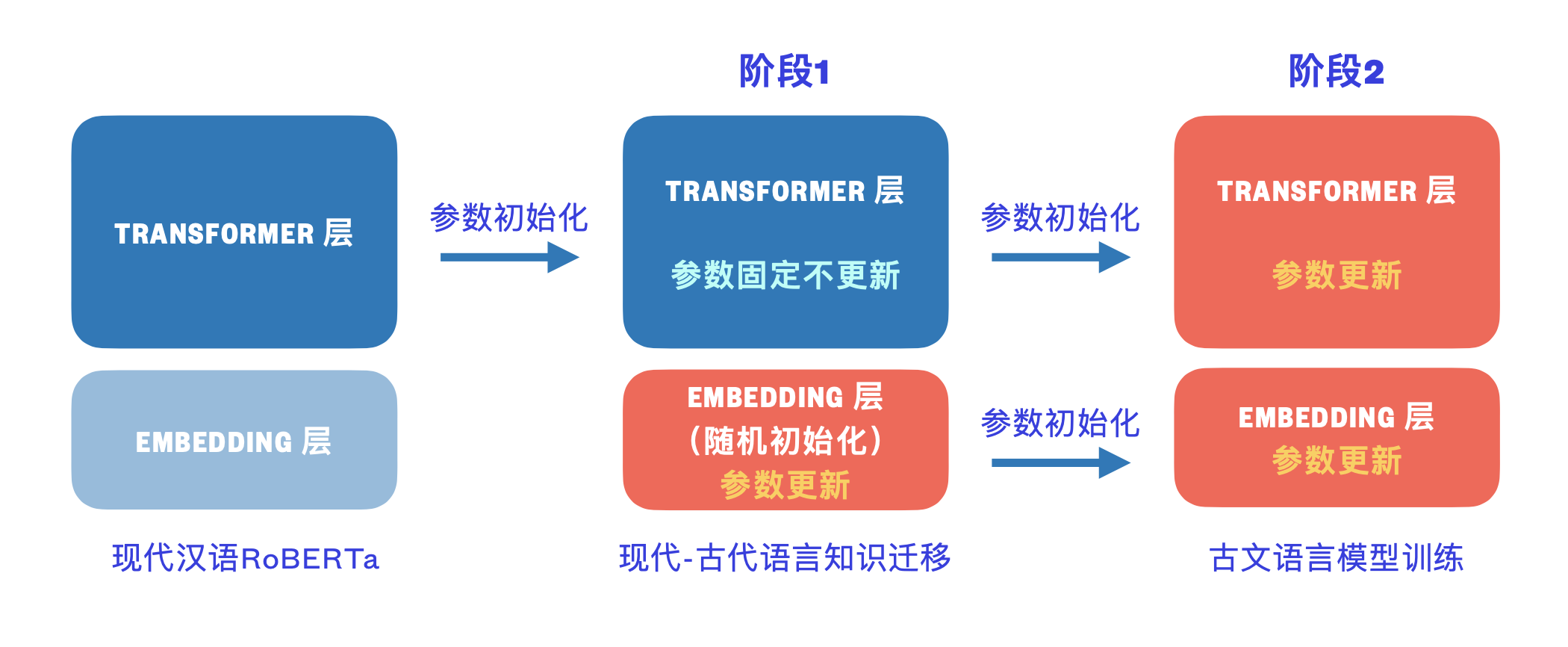 A: 两个阶段的语料、任务相同,唯一不同的只是第一阶段冻结了Transformer层,以便学习embeddings