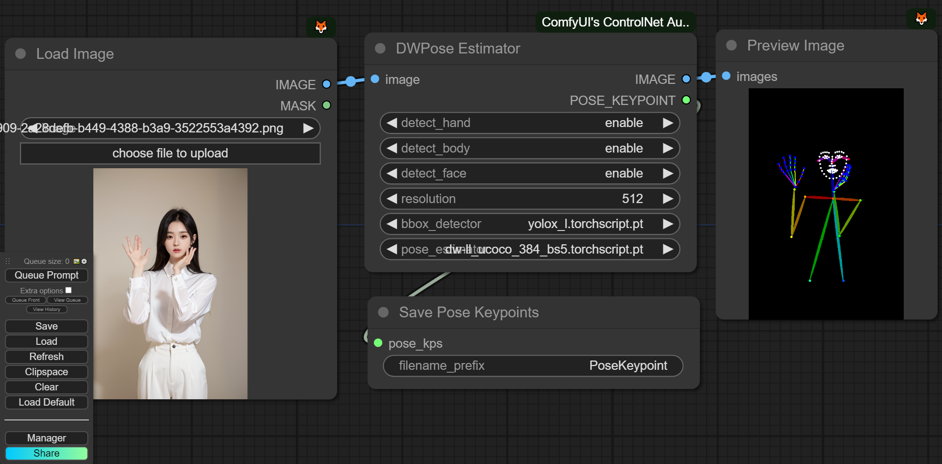 此工作流会将图像保存到 ComfyUI 的输出文件夹(与输出图像相同的位置)。如果您没有找到 Save Pose Keypoints 节点,请更新此扩展。