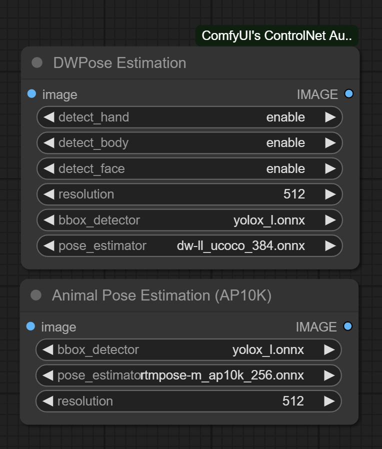 | DWPose 姿态估计器 | dw_openpose_full | control_v11p_sd15_openpose control_openpose t2iadapter_openpose |