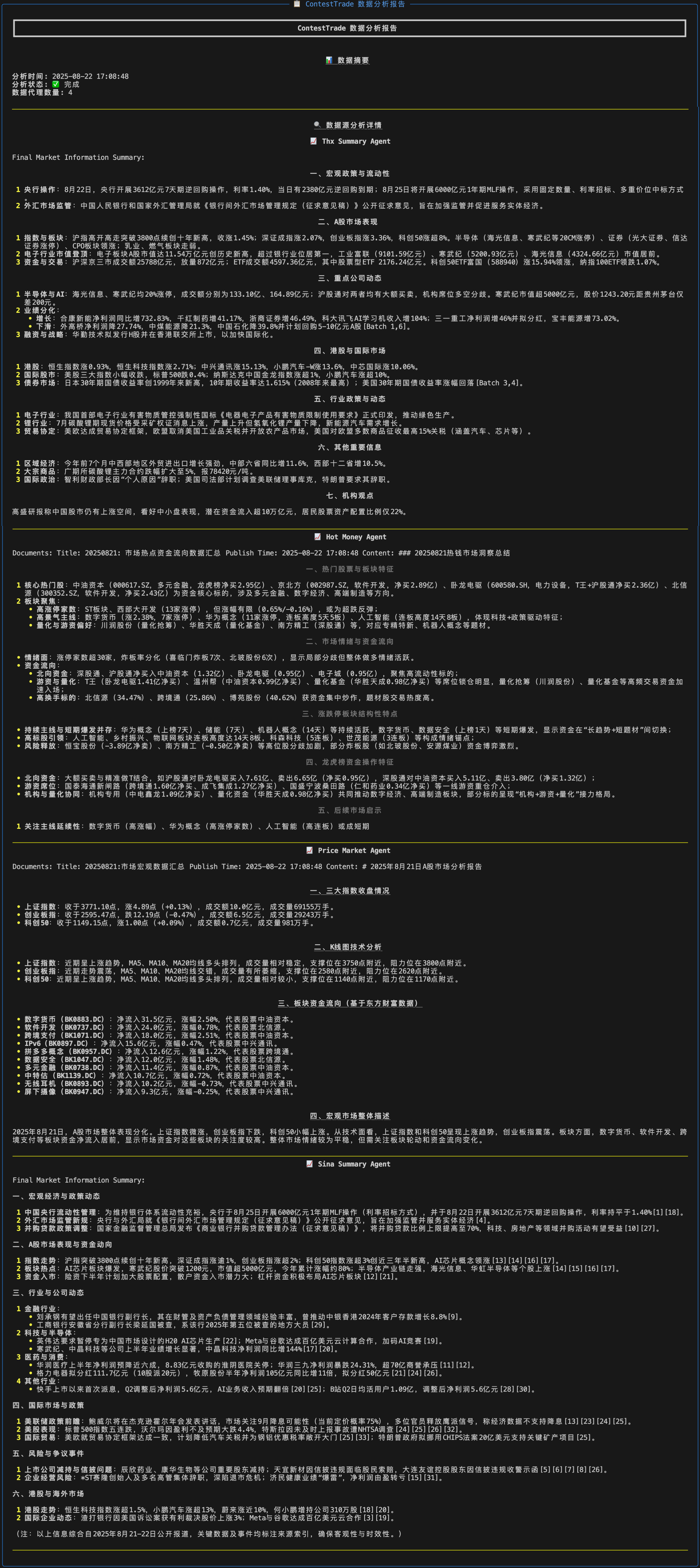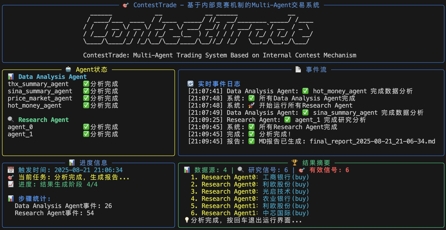 ContestTrade 是一个创新的多智能体(Multi-Agent)交易框架,通过ContestTrade 您可以轻松的打造一支专属的AI交易团队。只需设定分析时刻,它能在无人工干预的情况下自主扫描全市场,从海量数据中挖掘潜在事件驱动型的投资机会,并通过内部优选机制,为您构建最值得信赖的投资组合。