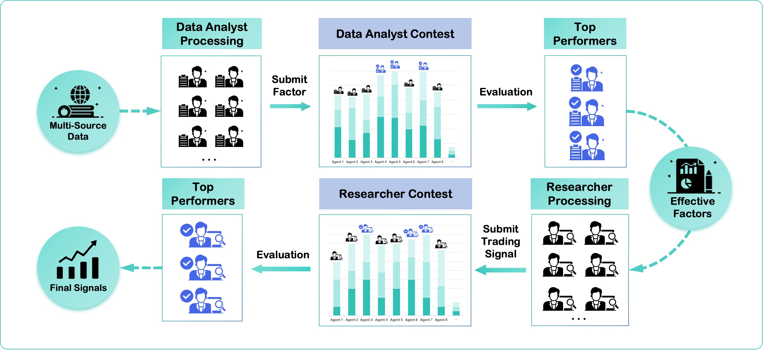 - 数据处理阶段: 首先,来自多个来源的原始市场数据被输入到数据团队。团队中的多个数据分析智能体 (Data Analysis Agents) 并行工作,将这些原始数据提炼成结构化的“文本因子”。在这一阶段,内部竞赛机制会评估每个数据智能体生成的因子的潜在价值,并构建出一个最优的“因子投资组合”。
