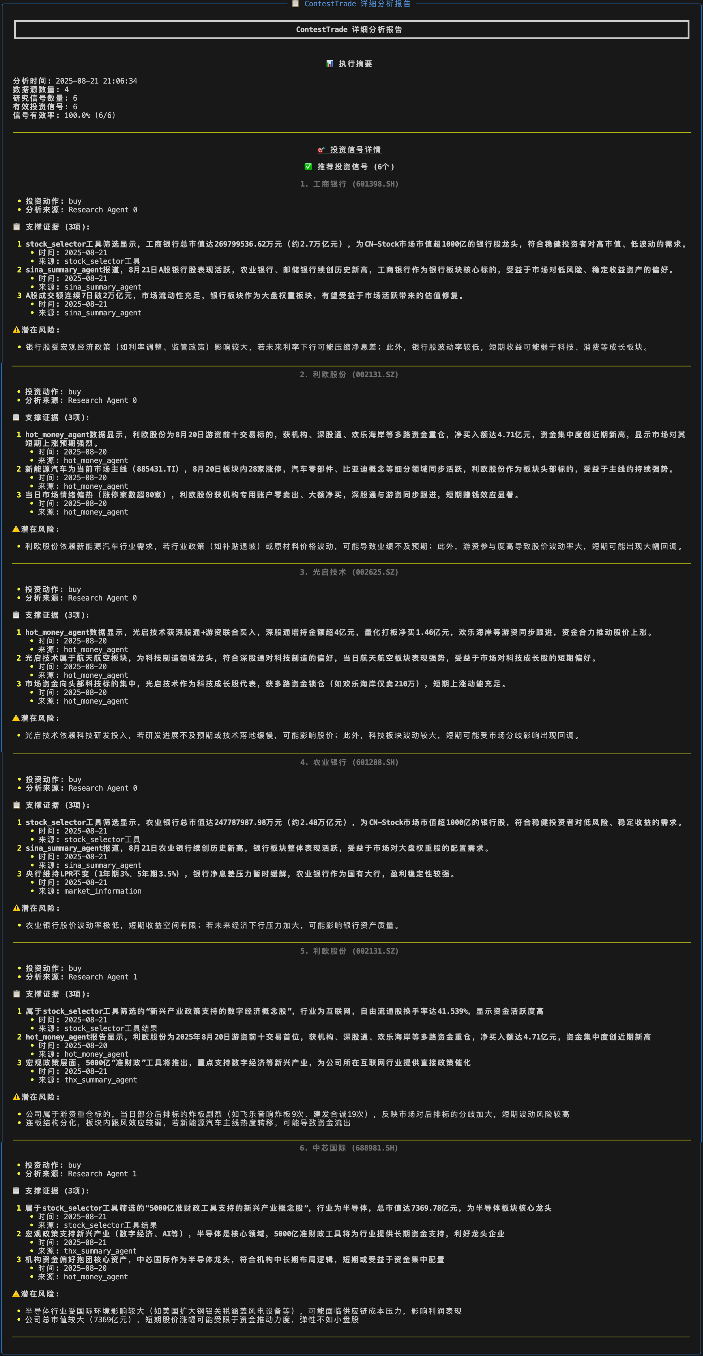 重要声明: 本项目 ContestTrade 是一个开源的量化交易Agent框架研究项目,仅供学术研究和教育目的使用。项目中包含的示例、数据和分析结果不构成任何形式的投资建议。