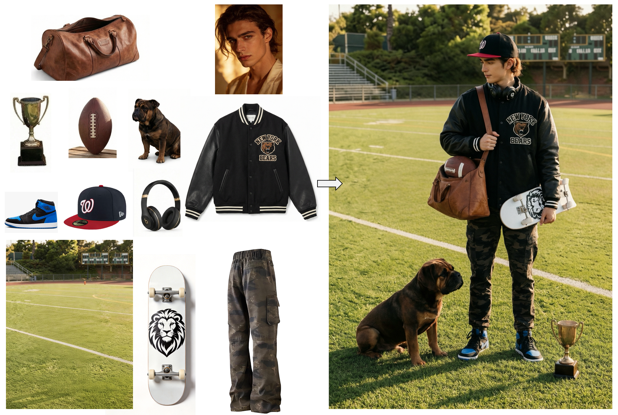 案例1:将图2中的男子,穿着图2的黑色“New York Bears”棒球夹克、迷彩裤子和蓝黑配色的AJ1高帮球鞋,置于图1空旷的橄榄球场上。球场阳光明媚,他头戴图2的黑色帽子,帽檐为红色,夹克上的白色条纹在暗光下格外醒目。他的左肩随意地挎着图3那只复古棕色皮质旅行包,包口微微敞开,露出里面图3那个磨损的棕色橄榄球。右手则轻松地拖着图3的白色滑板,板底那威武的黑色狮子图腾在草地映衬下如同猛兽。图3那只壮实的深棕色斗牛犬安静地蹲坐在他脚边的阴影里,忠诚地望向主人。男人脖子上挂着图2那副黑色Beats耳机,地上放着图3那座复古的青铜奖杯,在阳光下泛着胜利的光芒。整个场景融合了街头潮流与竞技体育的质感,空旷球场、皮革装备的温润光泽、以及滑板带来的街头气息,共同构成了一个关于青春、热爱与赛后孤独的静谧时刻。
