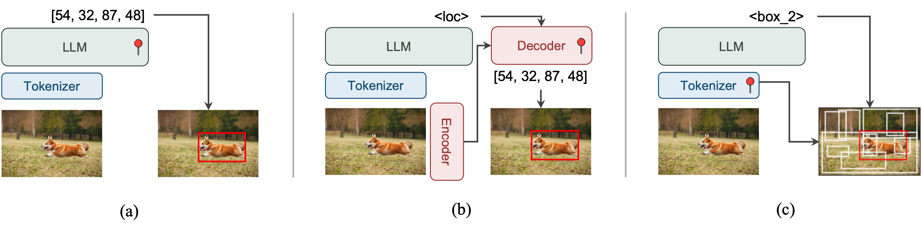 Groma 提出了一种全新的基于视觉定位的多模态大语言模型范式。(a)用于定位的大语言模型(如 Kosmos-2、Shikra);(b)用于定位的外部模块(如 Lisa);以及(c)用于定位的视觉分词器(Groma)。