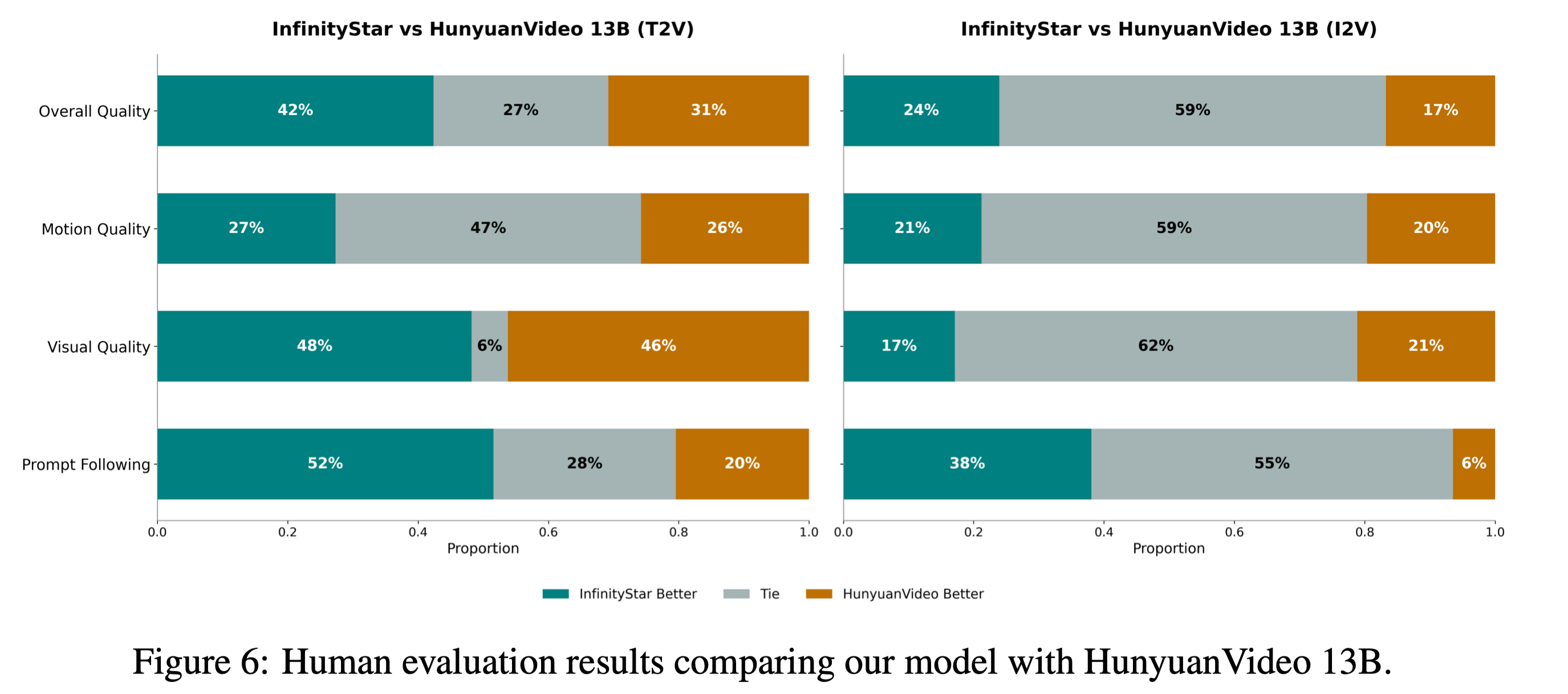 📖 开创性高分辨率自回归生成:据我们所知,InfinityStar是首个能够生成工业级720p视频的离散自回归视频生成器,为其类别树立了新的质量标准。