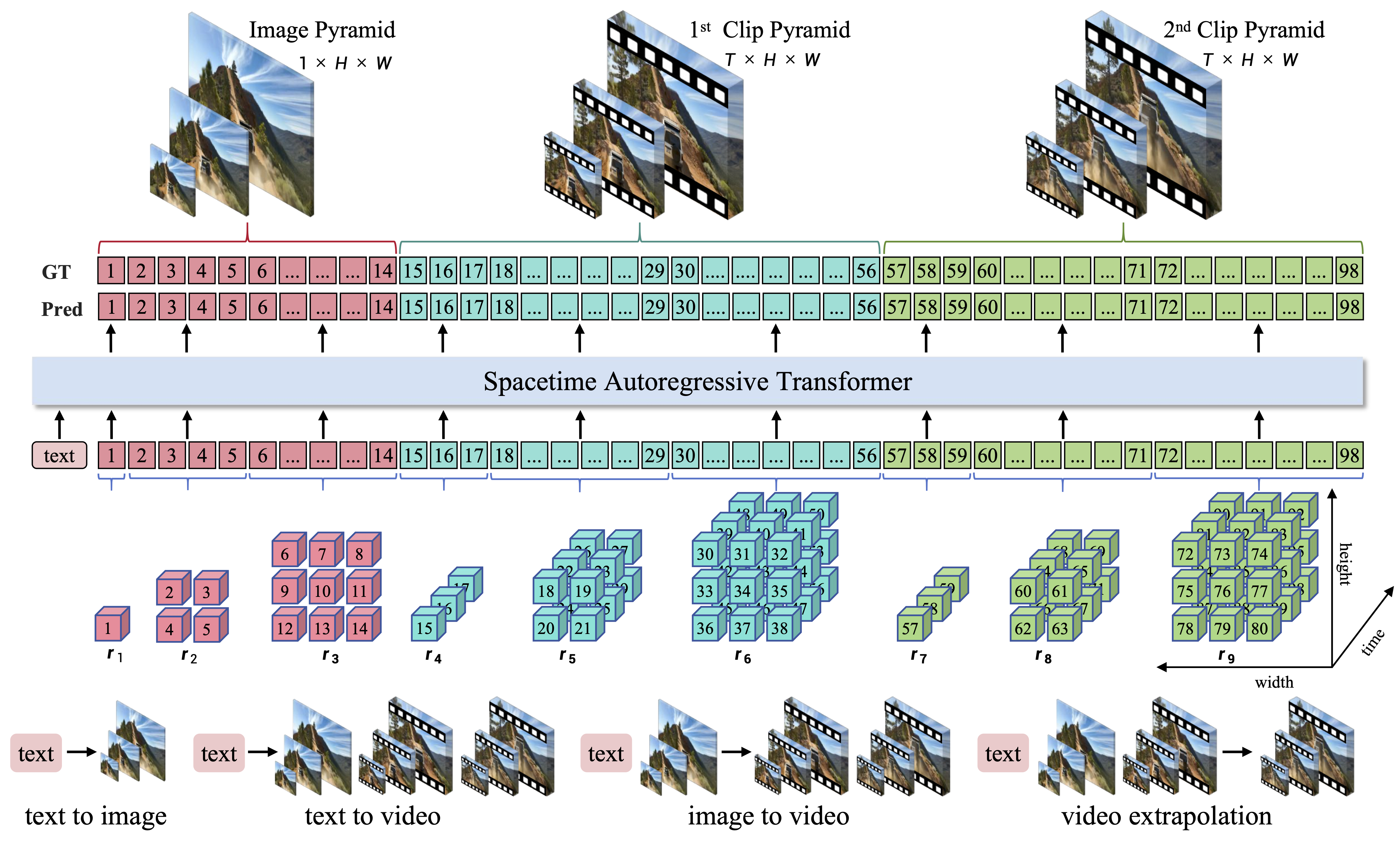 🎬 多任务生成:这种统一的设计自然支持多种生成任务,如文本到图像、文本到视频、图像到视频,以及通过简单的时间自回归实现的长时交互式视频合成。