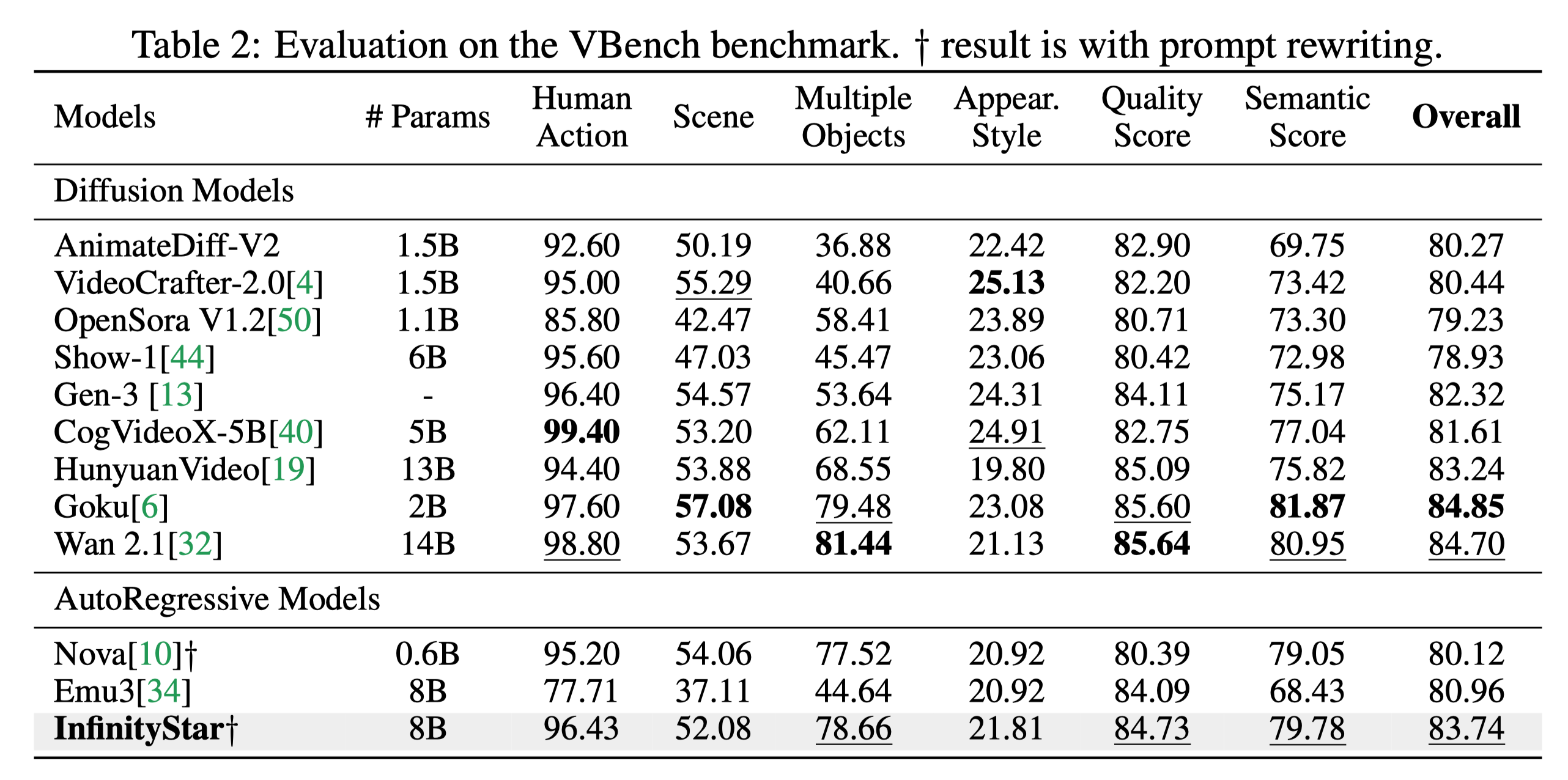 🏆 领先的性能与速度:通过大量实验,InfinityStar在VBench上取得了83.74分的成绩,大幅超越所有自回归模型,甚至优于扩散模型竞争对手如HunyuanVideo,且速度约为领先扩散方法的10倍。
