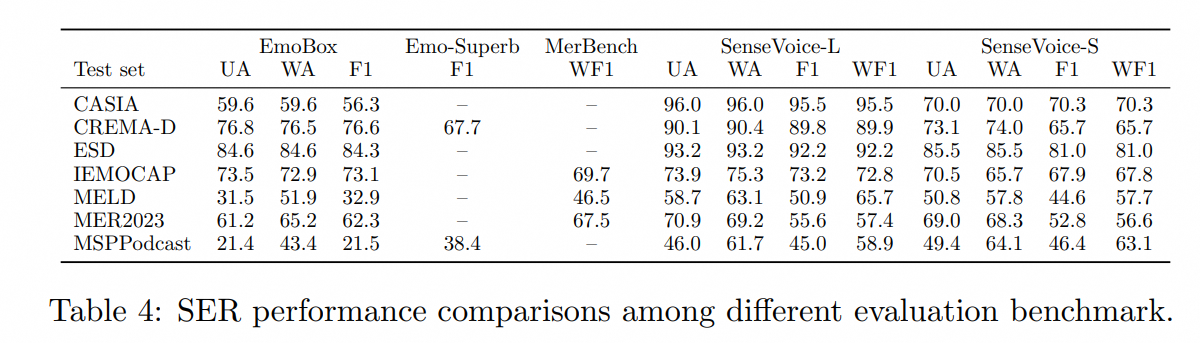 此外,我们还在这些测试集上对比了多个开源语音情感识别模型,结果显示 SenseVoice-Large 模型在几乎所有数据集上都取得了最佳成绩,而 SenseVoice-Small 模型也在大多数数据集上超越了其他开源模型。