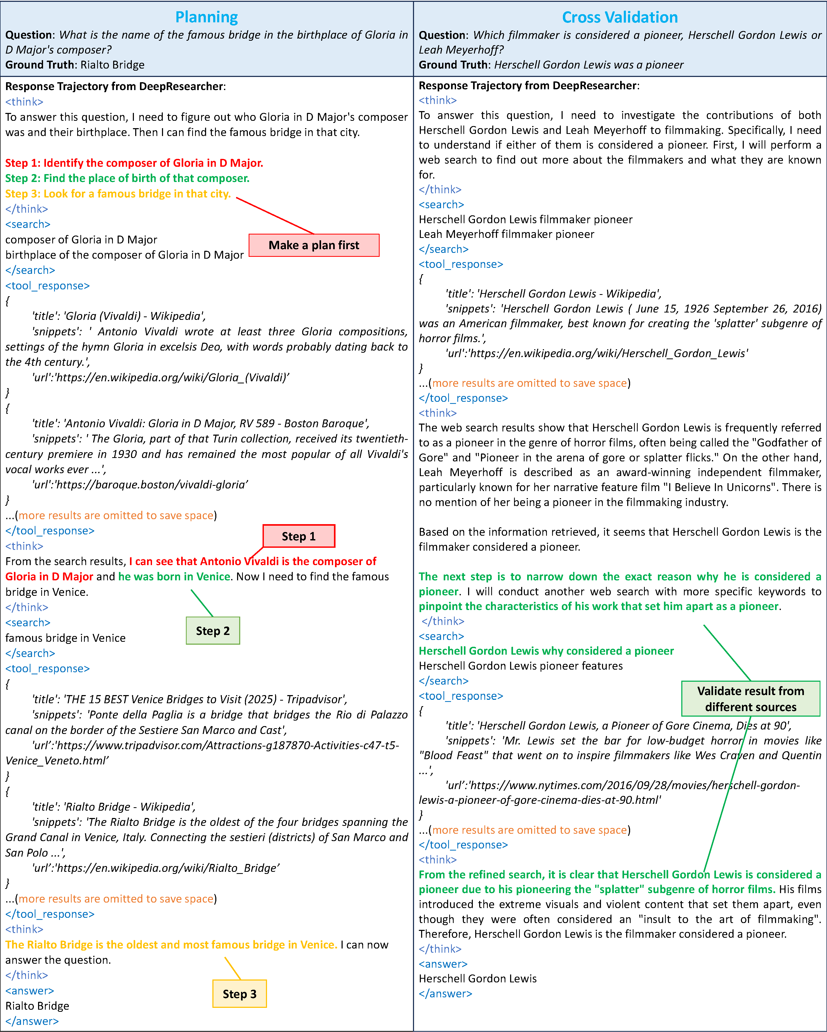 DeepResearcher 是首个端到端训练基于大语言模型的深度研究智能体的综合框架,它通过在包含真实网络搜索交互的真实环境中扩展强化学习(RL),实现了这一目标。我们的定性分析揭示了从端到端强化学习训练中涌现的 认知行为,包括制定计划、从多个来源交叉验证信息、进行自我反思以调整研究方向,以及在无法找到明确答案时保持诚实的能力。