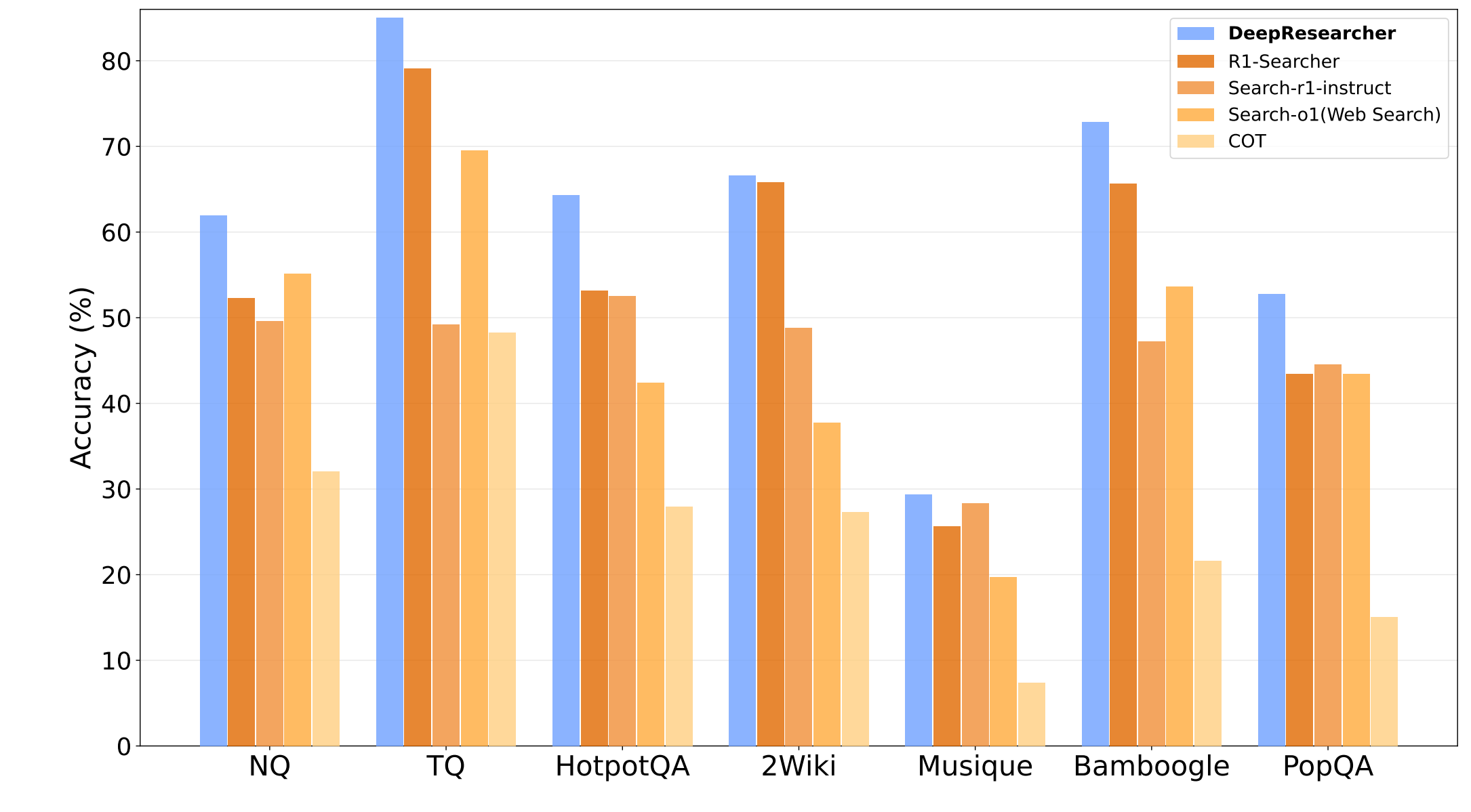 DeepResearcher 是一个专为大语言模型打造的深度研究智能体框架,旨在通过强化学习技术在真实的互联网环境中进行端到端训练。它主要解决了传统 AI 在复杂开放域研究任务中难以自主规划、验证信息及保持客观准确的问题。与依赖提示词工程或简单检索增强生成(RAG)的方案不同,DeepResearcher 让模型直接在真实网页搜索交互中学习,从而实现了显著的性能提升。