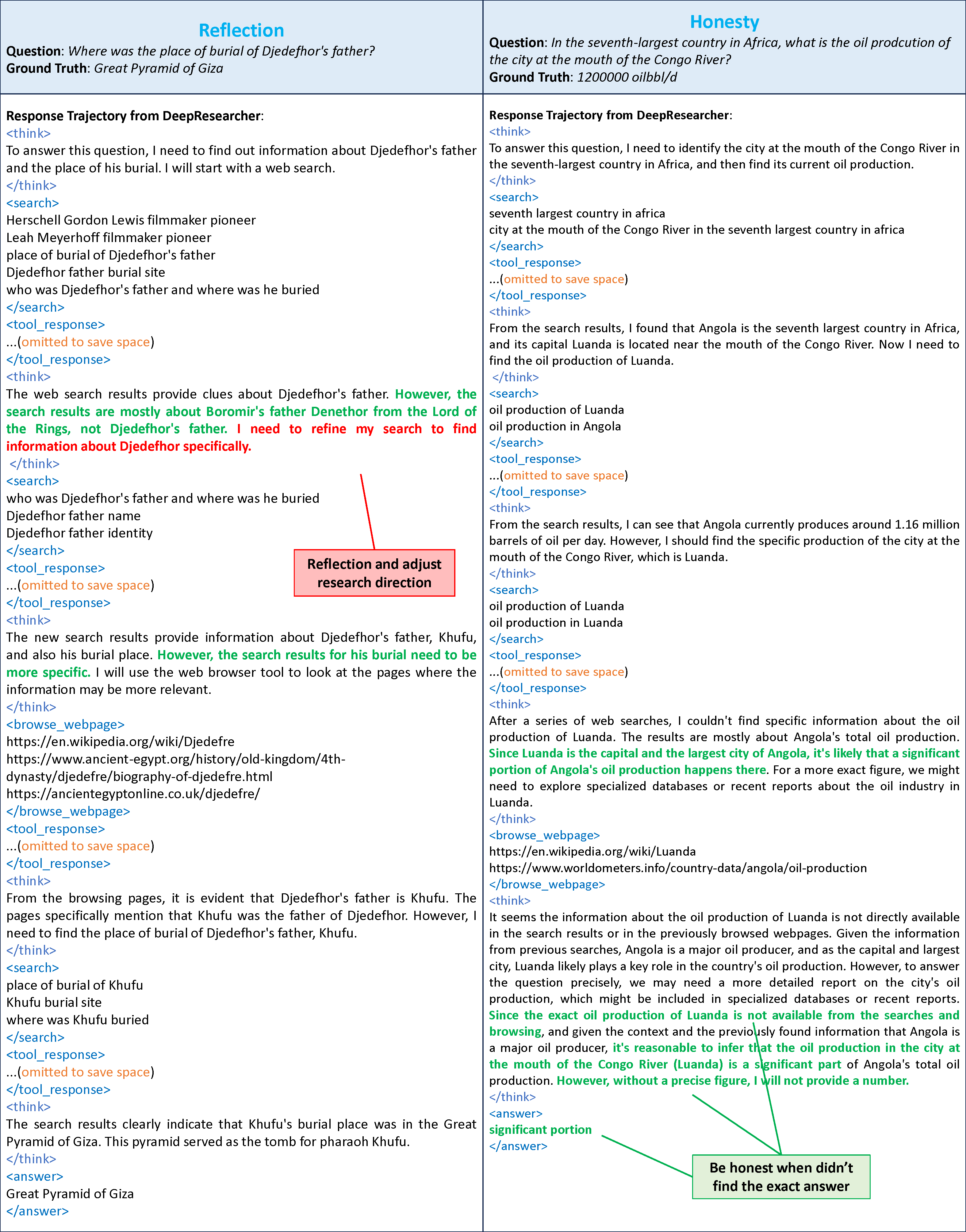 - 具备自我反思能力:在发现初始假设证据不足时,DeepResearcher 会主动修正搜索方向,转向替代性指标进行迂回验证,确保持续推进。