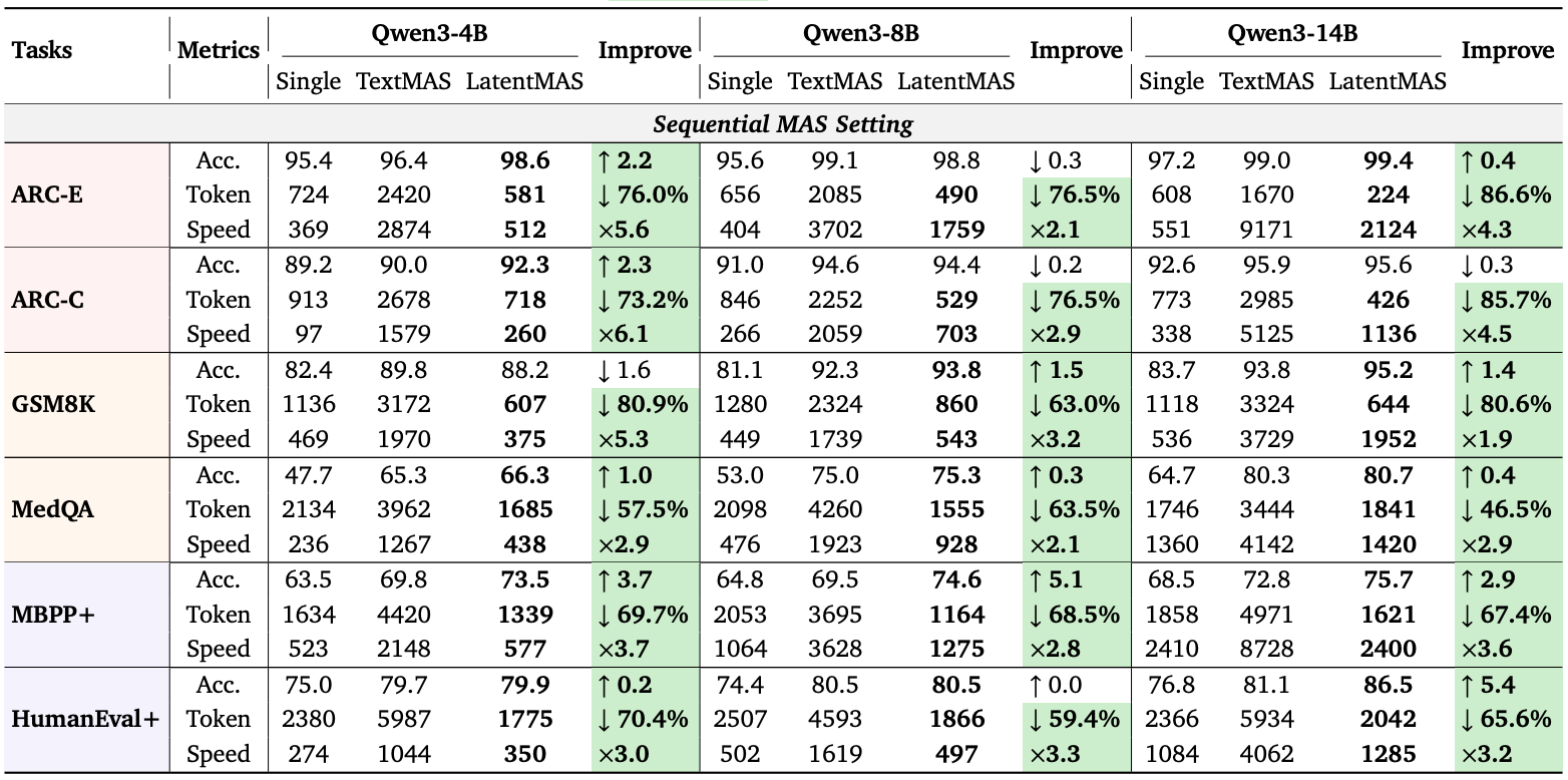 表 1 — LatentMAS 在顺序多智能体设置下的表现