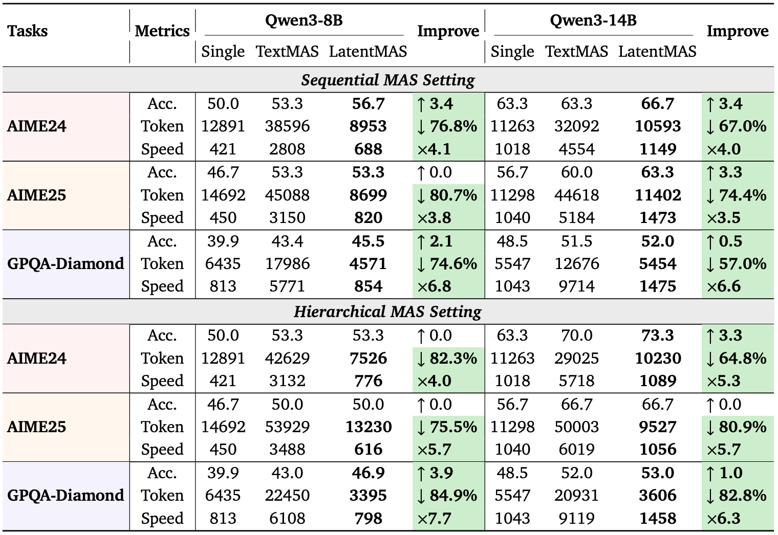 - 隐空间直连:智能体直接在模型的潜空间(Latent Space)通过工作记忆传递“潜在思维”,彻底消除了冗余的文本生成过程,Token 用量减少 90% 以上。