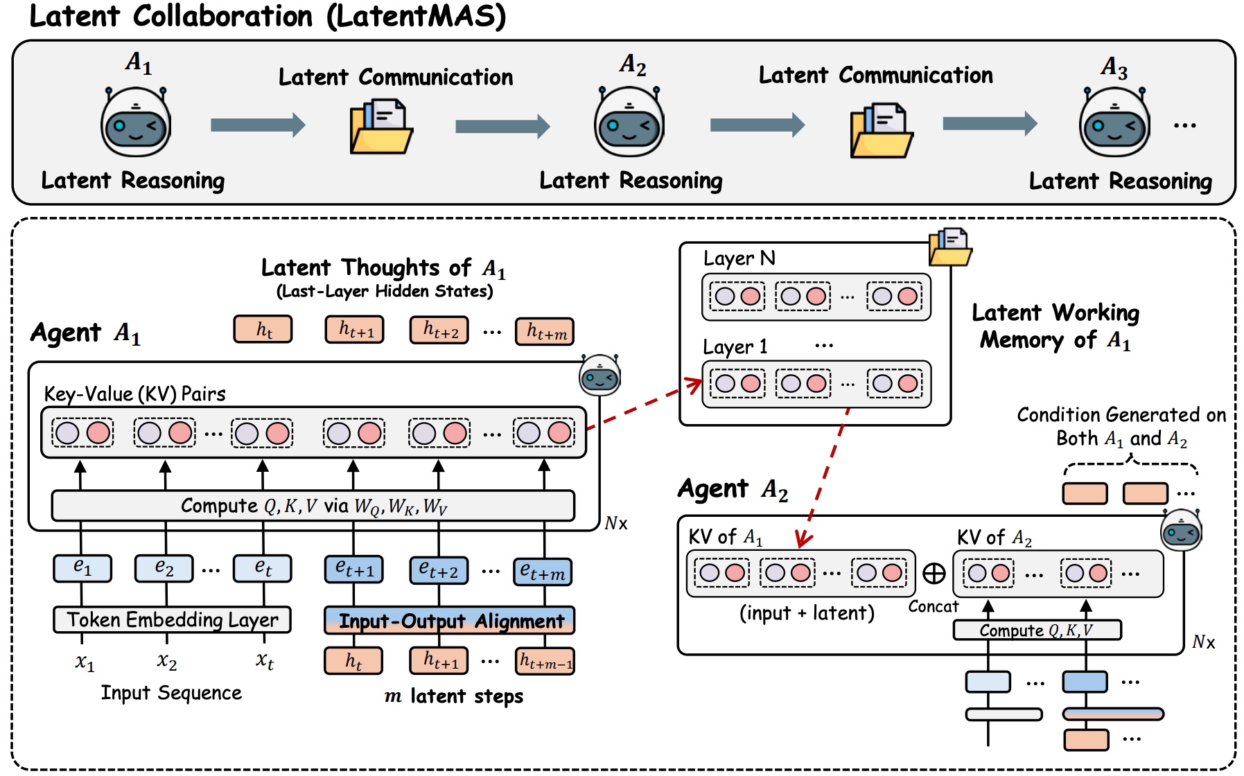 LatentMAS 是一种多智能体推理框架,它将智能体协作从标记空间转移到模型的潜在空间。