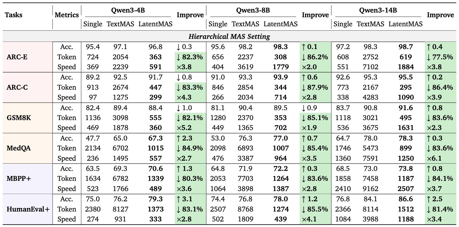 表 2 — LatentMAS 在层次化多智能体设置下的表现