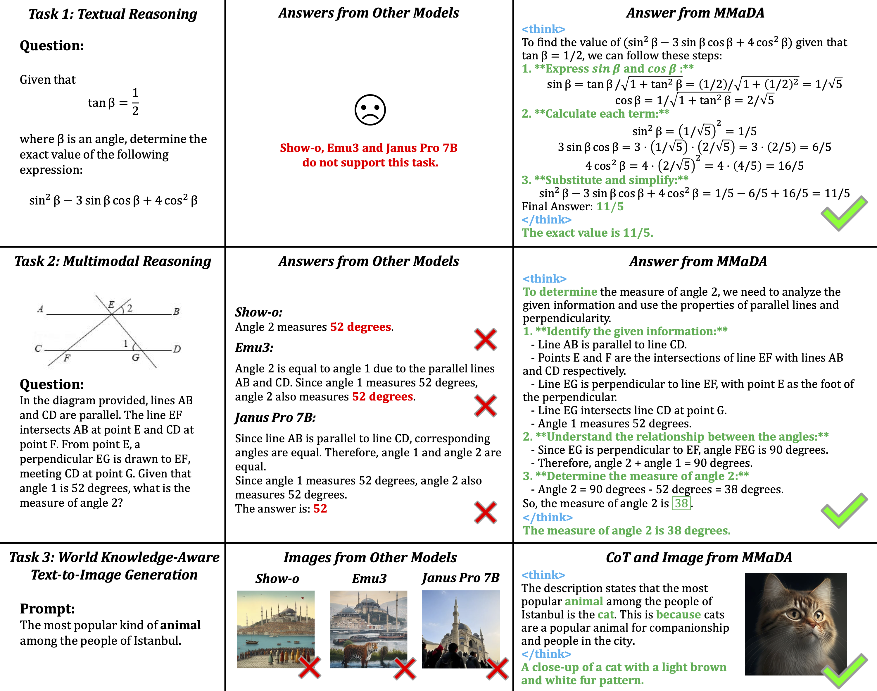 - 跨模态语义强对齐:基于混合长思维链(Mixed-CoT)微调,MMaDA 能确保图片中的每一个像素细节都严格呼应文案中的推理结论。